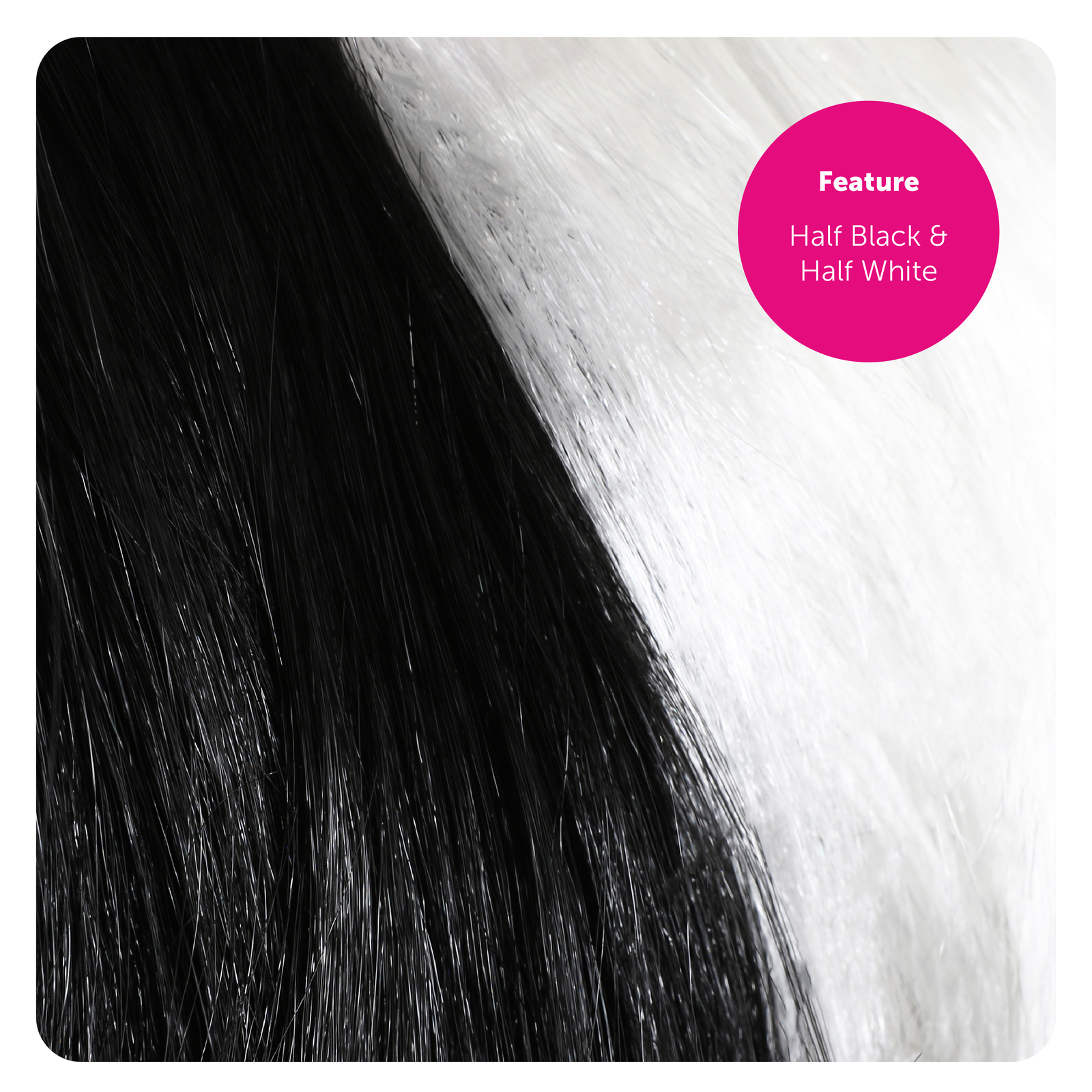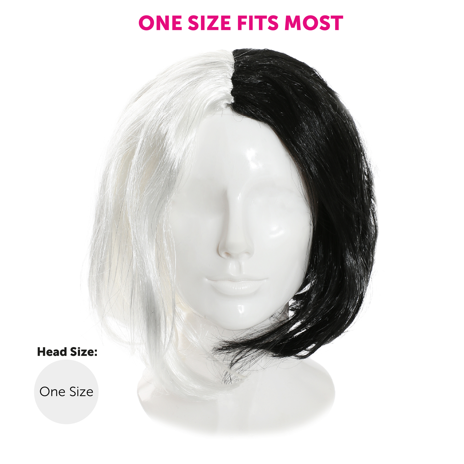 BLACK AND WHITE WIG DETAILS: Your Adult’s Black and White Wig is a half-and-half Black and White wig, which can be backcombed for any desired effect, and is suitable for adult heads of all ages!