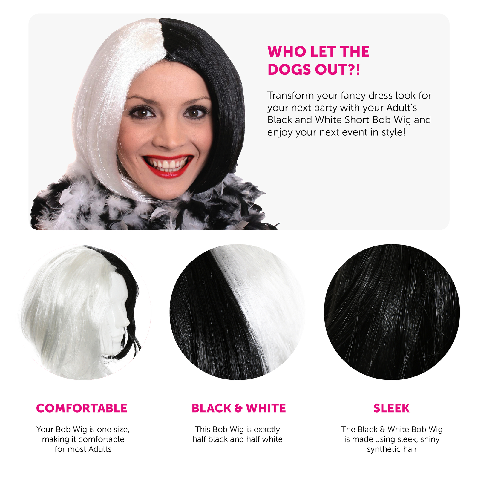 ADULT’S BLACK AND WHITE WIG: Transform your fancy dress look for your next party with your Adult’s Black and White Wig and enjoy your next event in style!