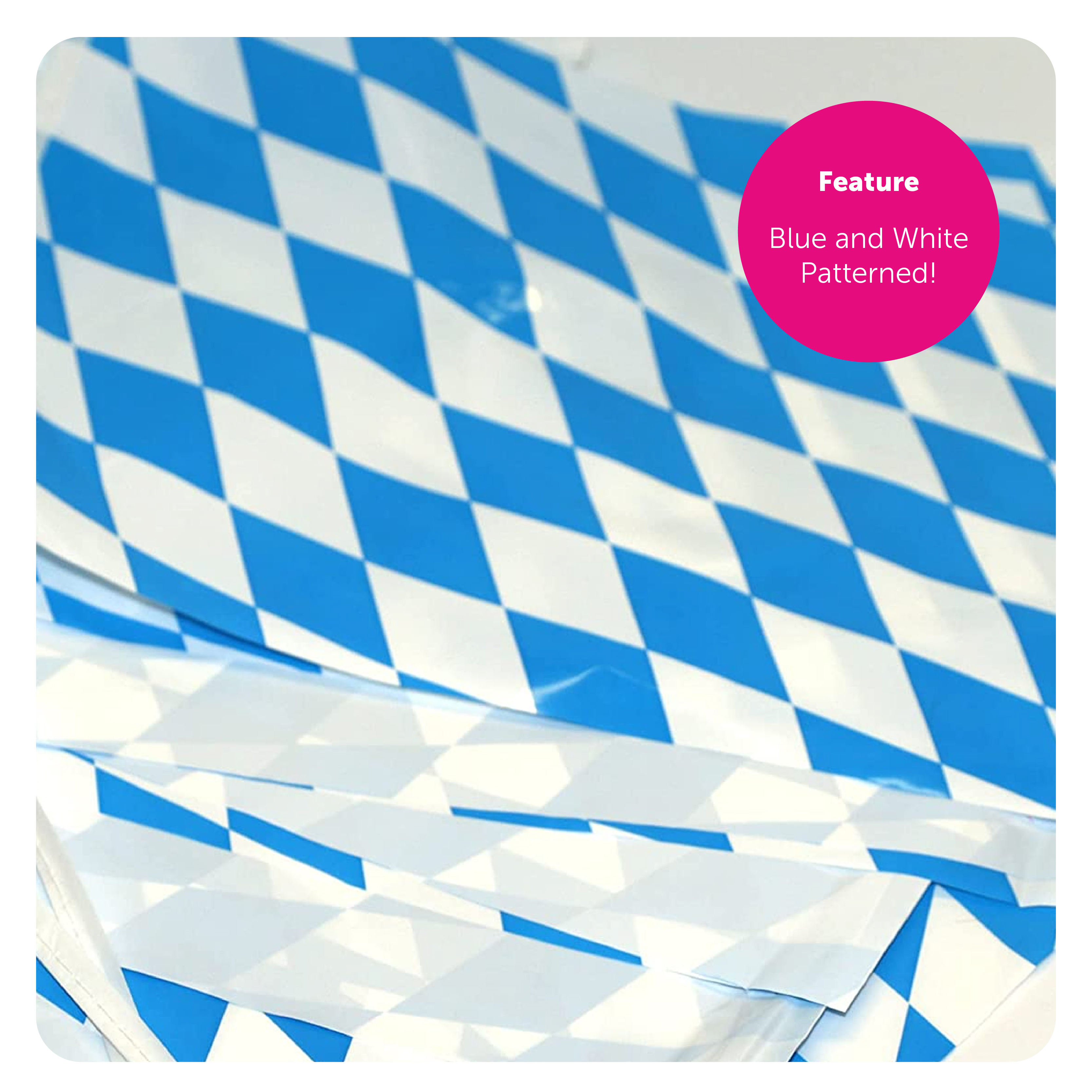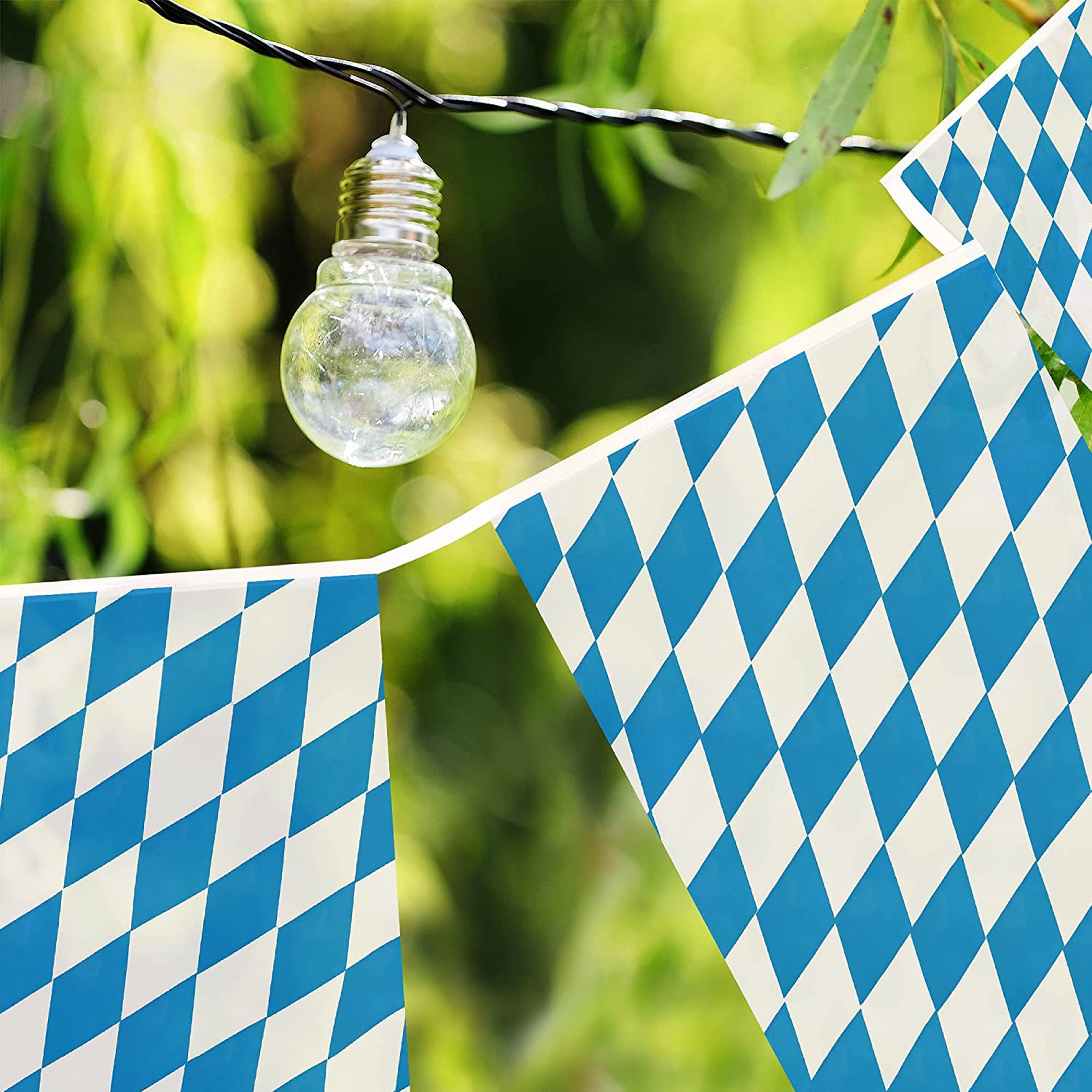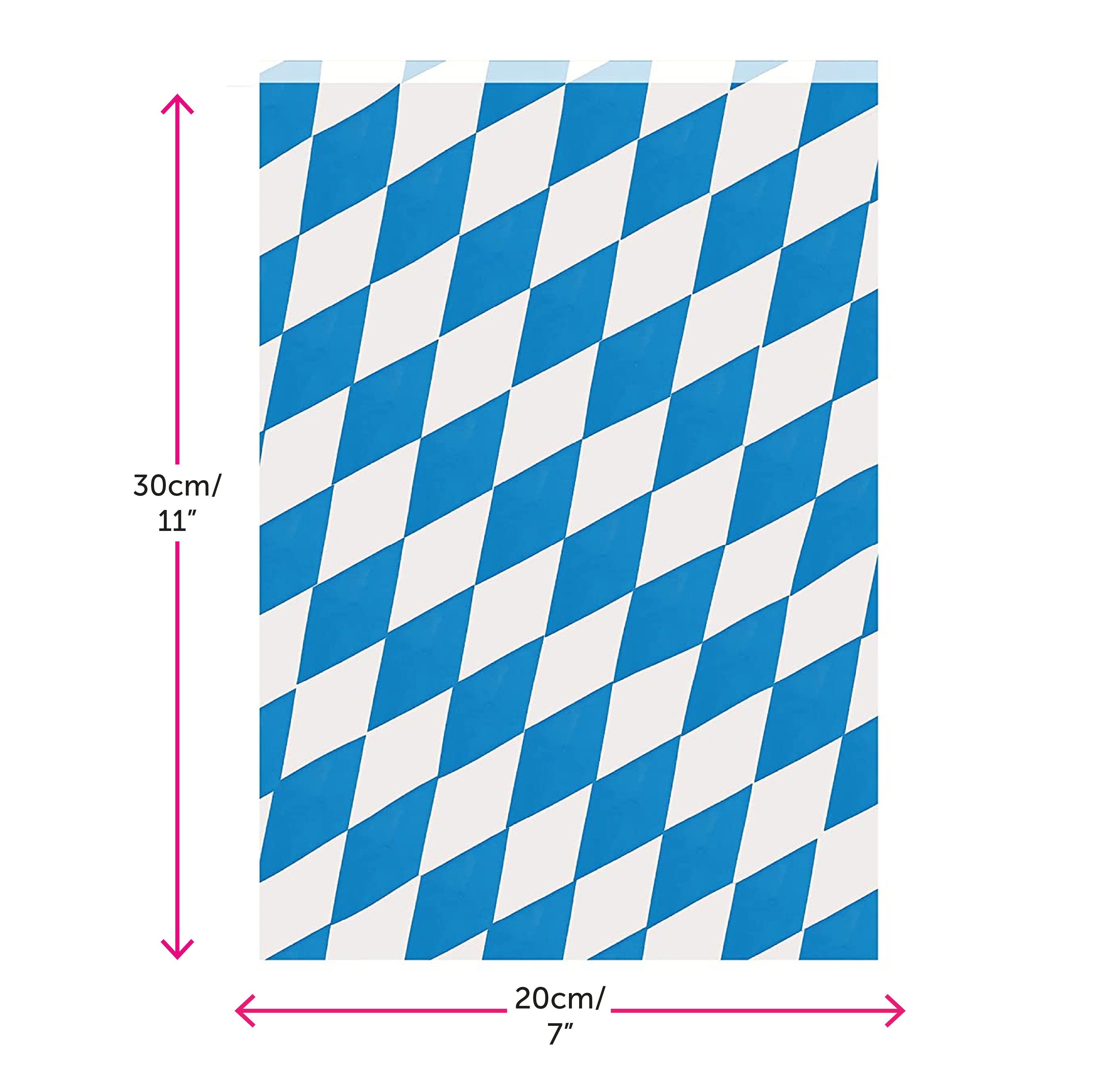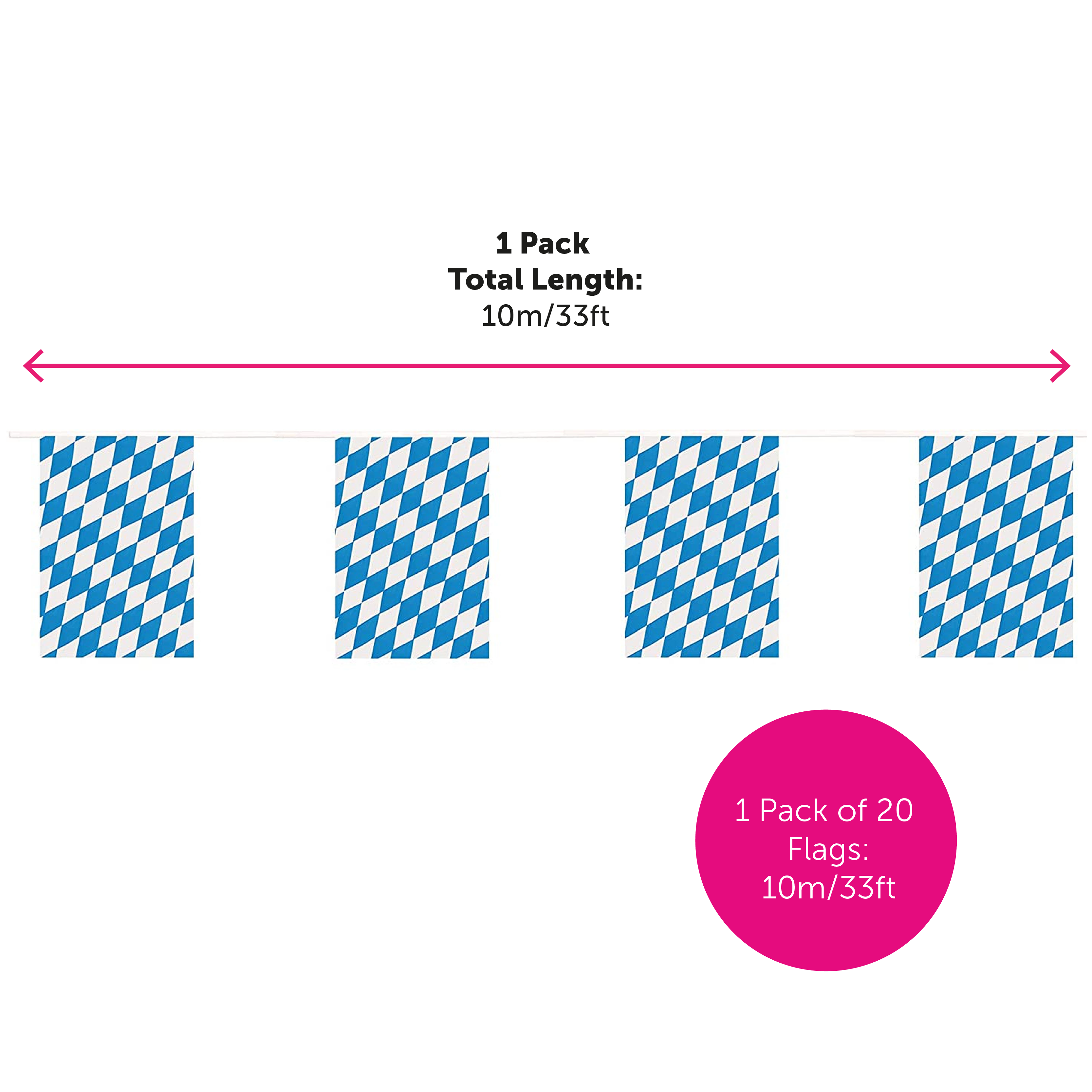 BAVARIAN BUNTING DETAILS: Your Bavarian Bunting is a Blue and White diamond patterned Oktoberfest-themed flag bunting, with the flag bunting measurements 30cm/12” x 20cm/8” for each individual flag, 10m/33ft long – 20 Flags per bunting length!