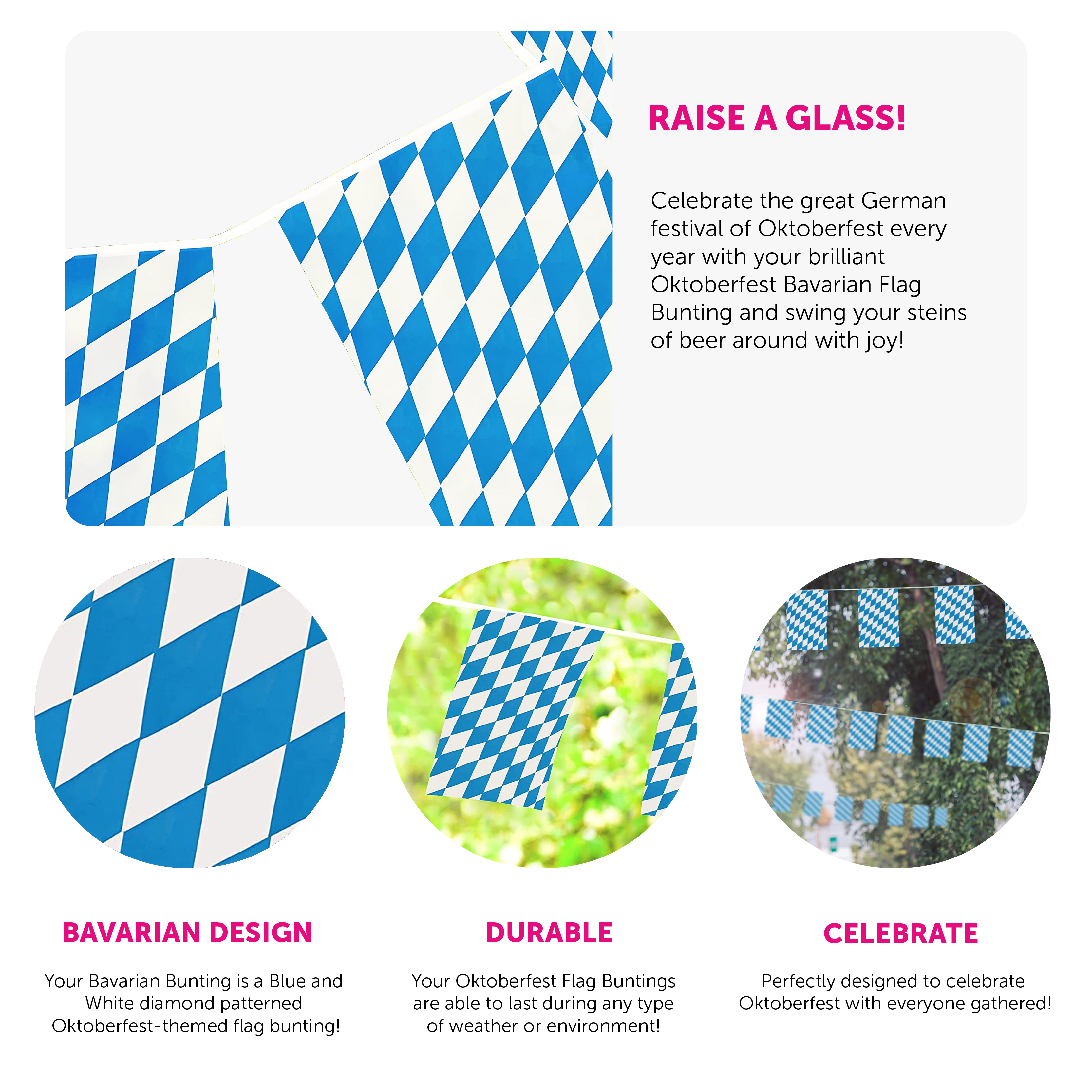 PERFECT FOR OKTOBERFEST AND GERMAN THEMED PARTIES: Whether you’re enjoying a German Themed Party, or celebrating Oktoberfest with your friends and family, our Oktoberfest Bavarian Flag Bunting is the perfect accessory for the occasion!