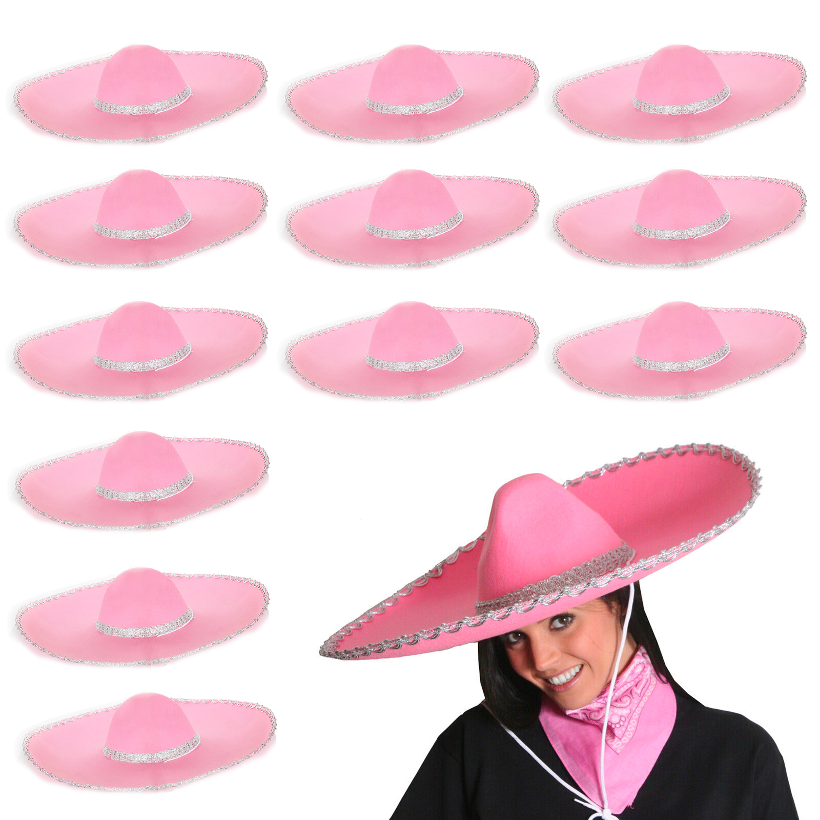 PACK OF 12 HUGE FELT SOMBRERO IN PINK WITH SILVER BRAIDING AROUND EDGE OF HAT