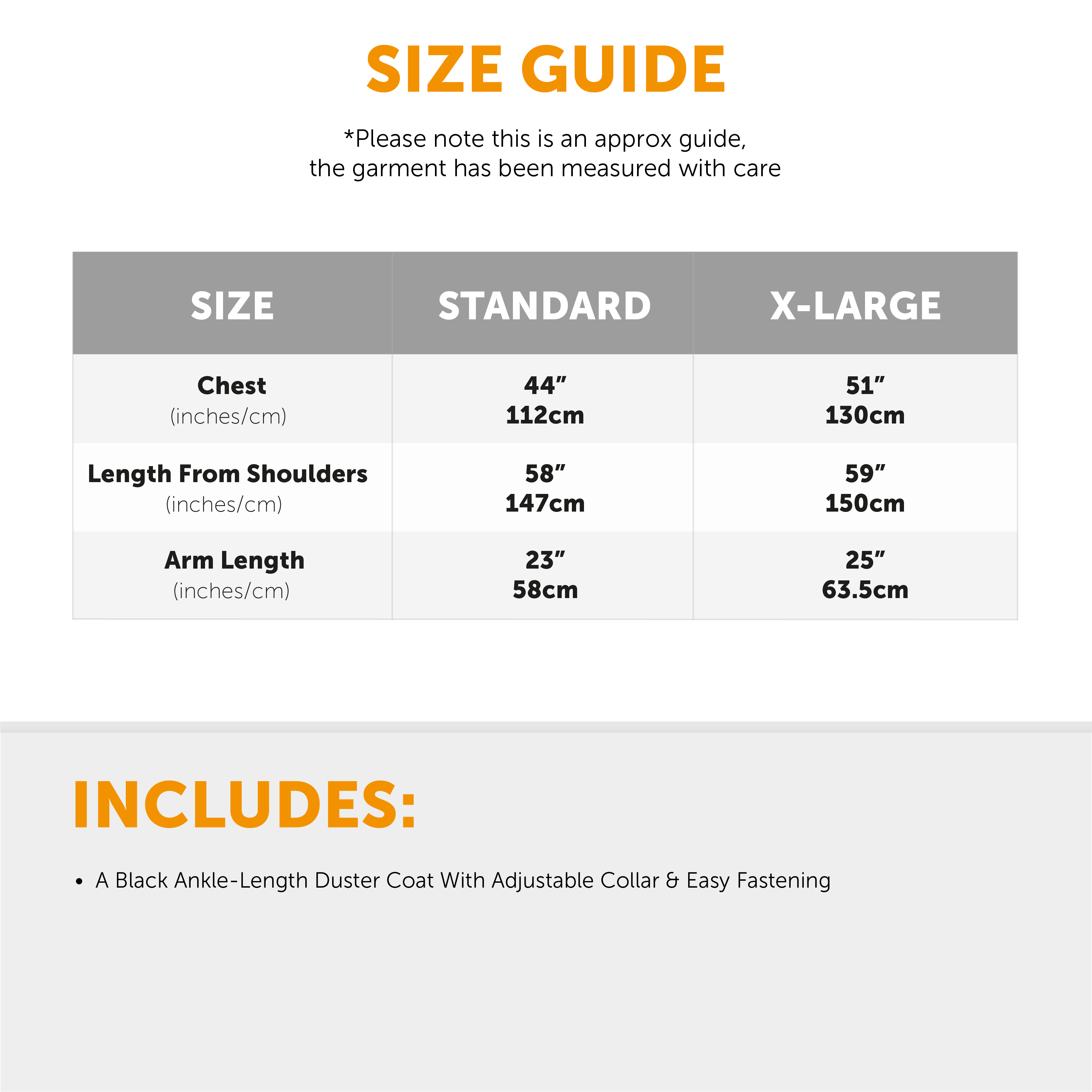 STANDARD - CHEST 112CM (44") LENGTH FROM SHOULDER 147CM (57"), ARM 58CM (22")