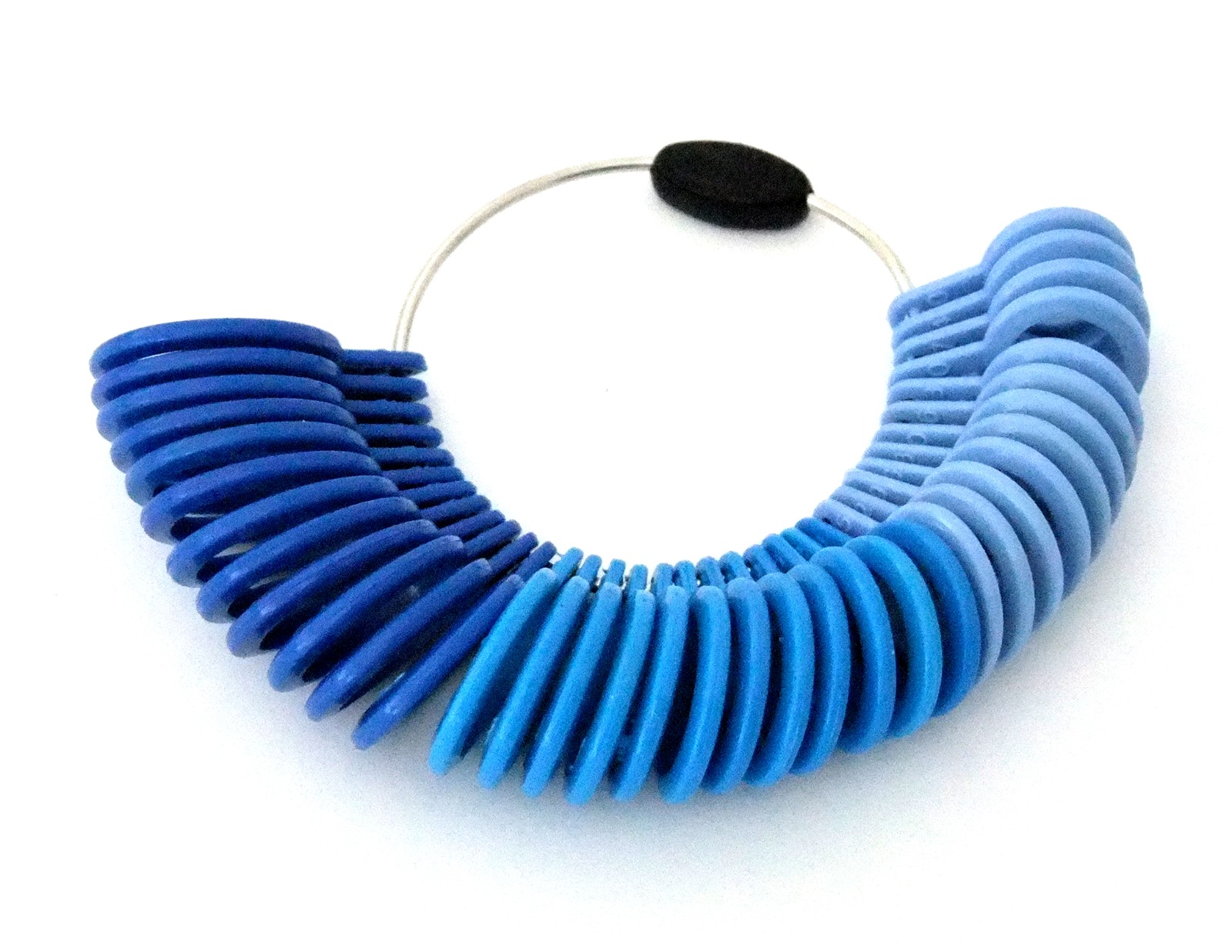 A blue plastic finger sizers that measures sizes 1 to 15 1/2 in full and half sizes and some 1/4 sizes.