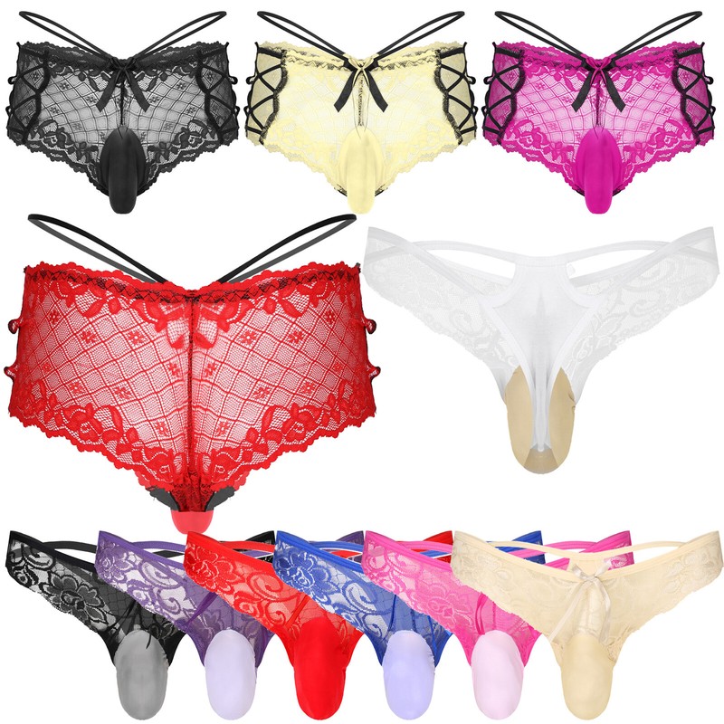 Men’s bikini G-string underwear lingerie, low rise, pull on closure.