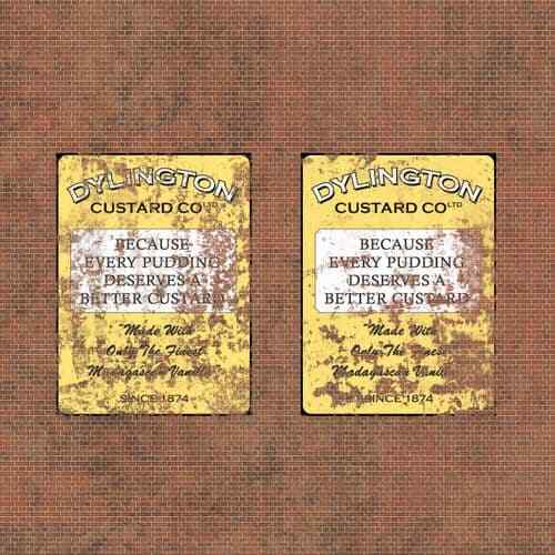 Pack contains two uniquely weathered fictitious Dylington Custard Company Ghost Signs measuring approximately 38mm x 52mm.
