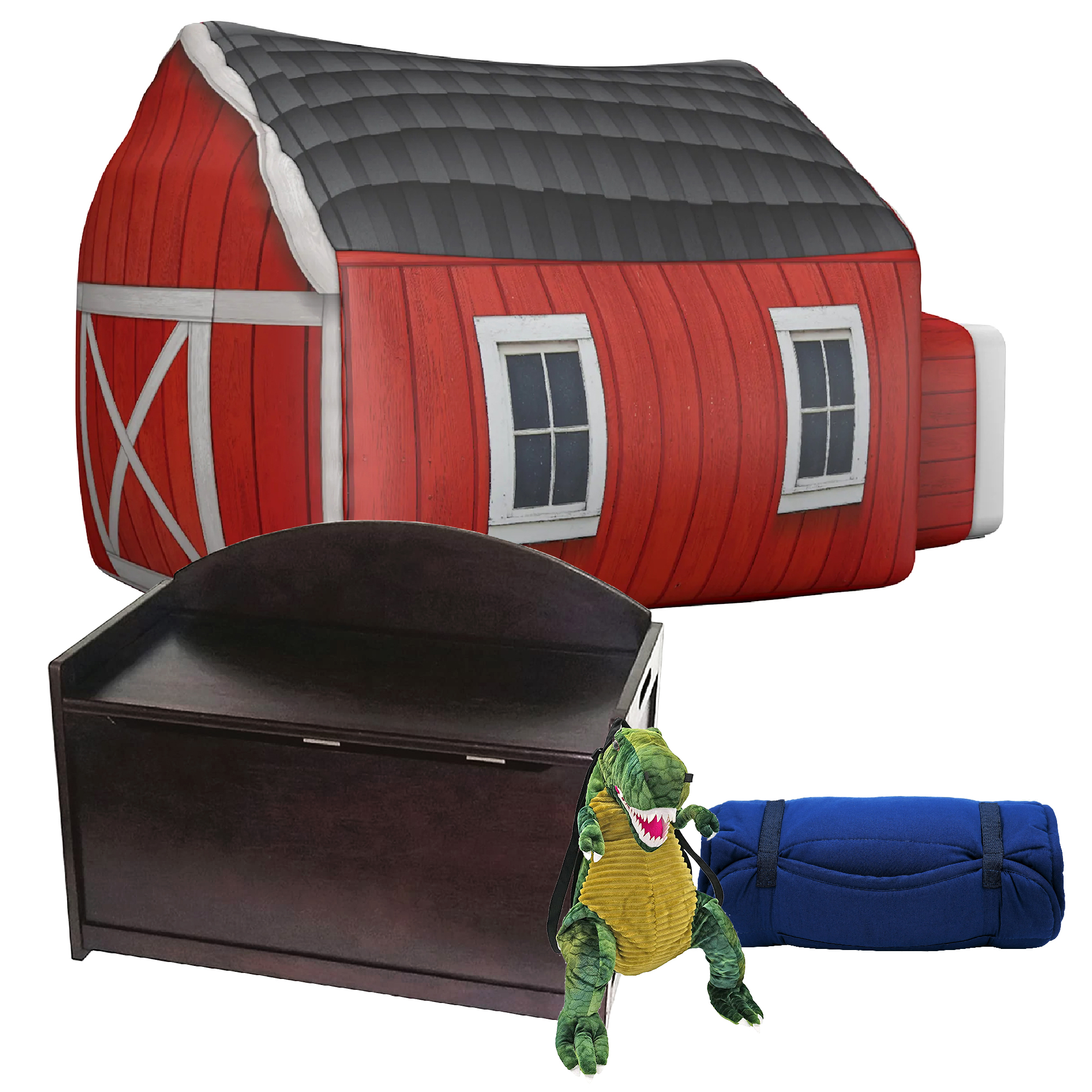 This bundle includes a Lipper child's toy box in espresso, a barn air fort, a dinosaur T-Rex backpack, & a bug nap mat.
