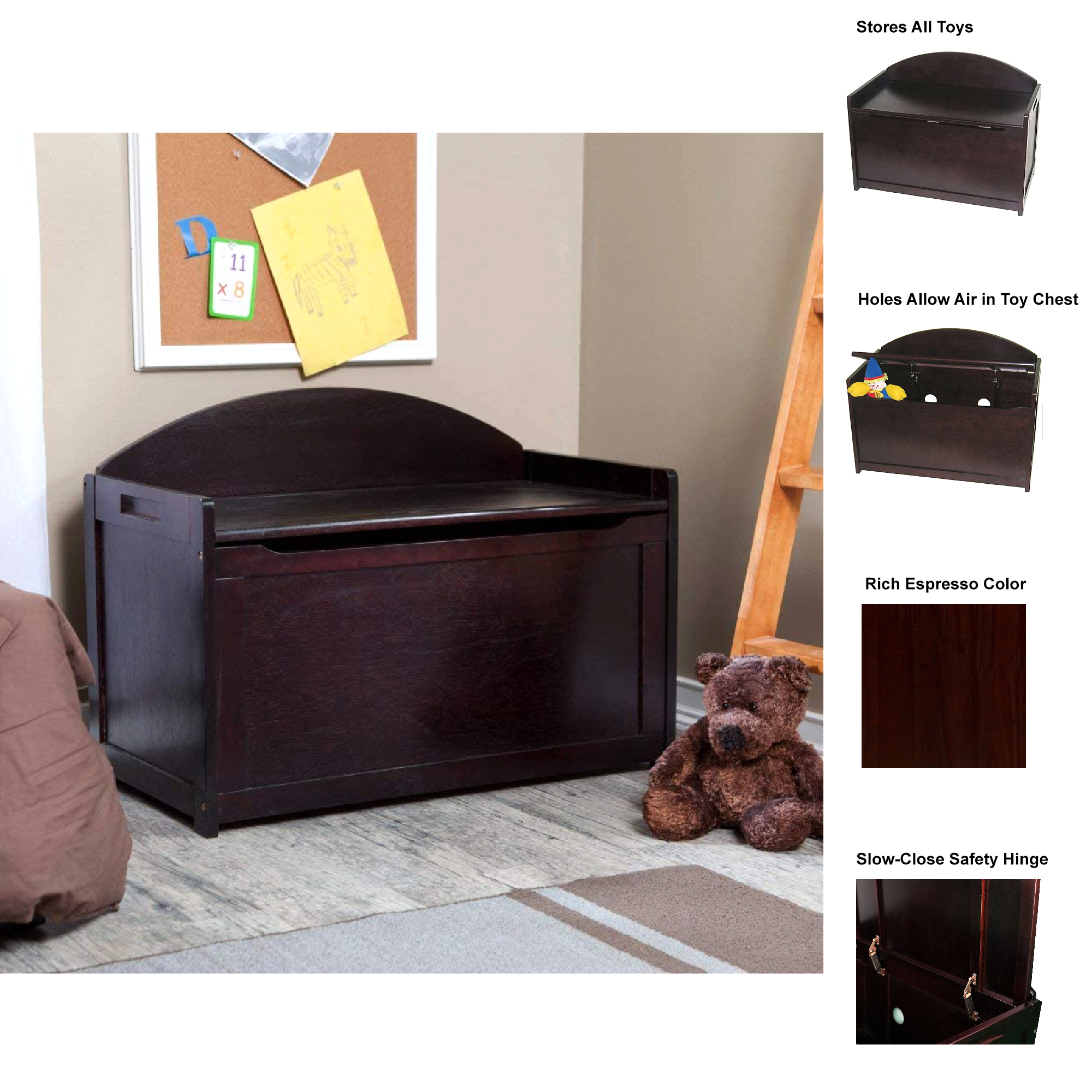 Constructed of sturdy beechwood, & finished with a rich espresso stain, this generously sized toy chest exceeds all safety requirements. Easy to assemble with hardware included.
