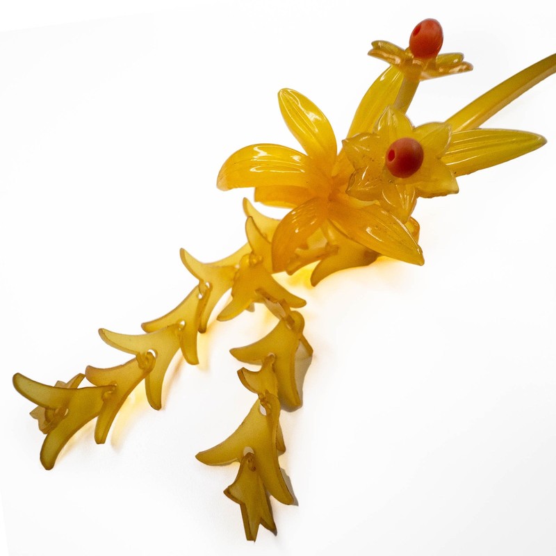 This item is made of a vintage type of translucent celluloid made to mimic tortoise shell. It has two flowers and dangling strands in a wisteria design.