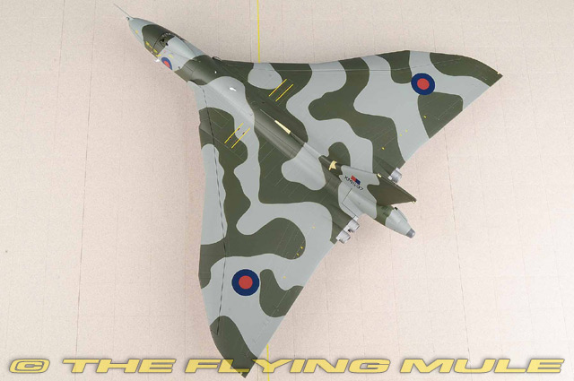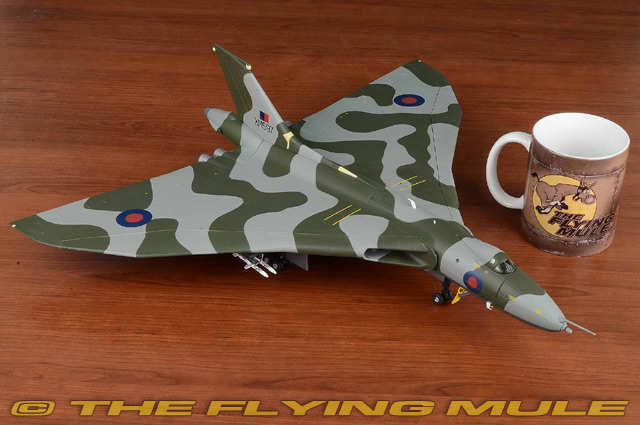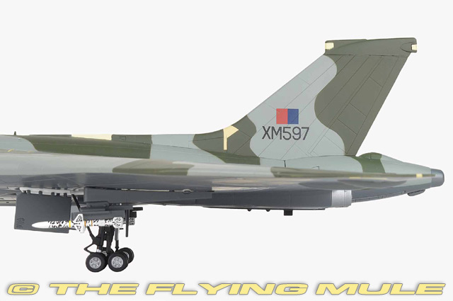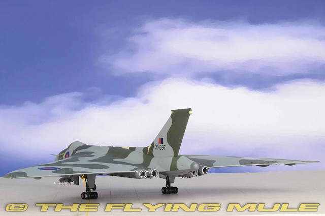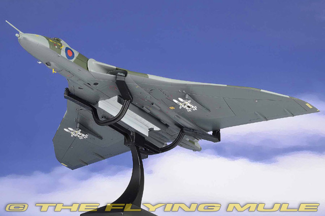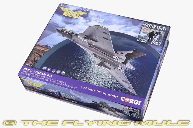 Vulcan XM597 was on her way back to Ascension Island from a missile strike when trouble struck. While refuelling from a Victor tanker aircraft, she fractured a fuel probe. Short of fuel and in serious difficulty, the Vulcan was forced to divert to Rio de Janeiro Airport in Brazil. The pilot managed a remarkable landing on the short stretch of runway. The aeroplane was immediately seized by the Brazilian authorities and the crew were stranded for seven days. XM597 was eventually released on condition that she take no further part in hostilities. Avro Vulcan B.Mk 2Designed to meet an Air Ministry specification for a high-speed, high-altitude, long-range nuclear bomber, the Avro Vulcan was first flown on August 30, 1952. Though revolutionary, the Vulcan's original delta wing tailless design was an unknown quantity. The first prototype crashed in the fall of 1949 and the early straight leading edge design was later modified to kink towards the wingtip, giving the service aircraft superior flying characteristics. Carrying Britain's first nuclear weapon (the Blue Danube), the Vulcan's original role was nuclear deterrence, but it was later modified for air-to-air refueling missions and maritime radar reconnaissance.© Copyright 2003-2026 The Flying Mule, Inc. Corgi Aviation Archive Collector SeriesThe Corgi "Aviation Archive" range presents highly-detailed, ready-made diecast models of military and civilian aircraft. The vast Aviation Archive range has become the standard by which all other diecast airplane ranges are judged. Each Corgi model is based on a specific aircraft from an important historical or modern era of flight, and has been authentically detailed from original documents and archival library material. Famous airplanes and aviators from both military and commercial airline aviation are all honored.Corgi "Aviation Archive" diecast airplanes feature: