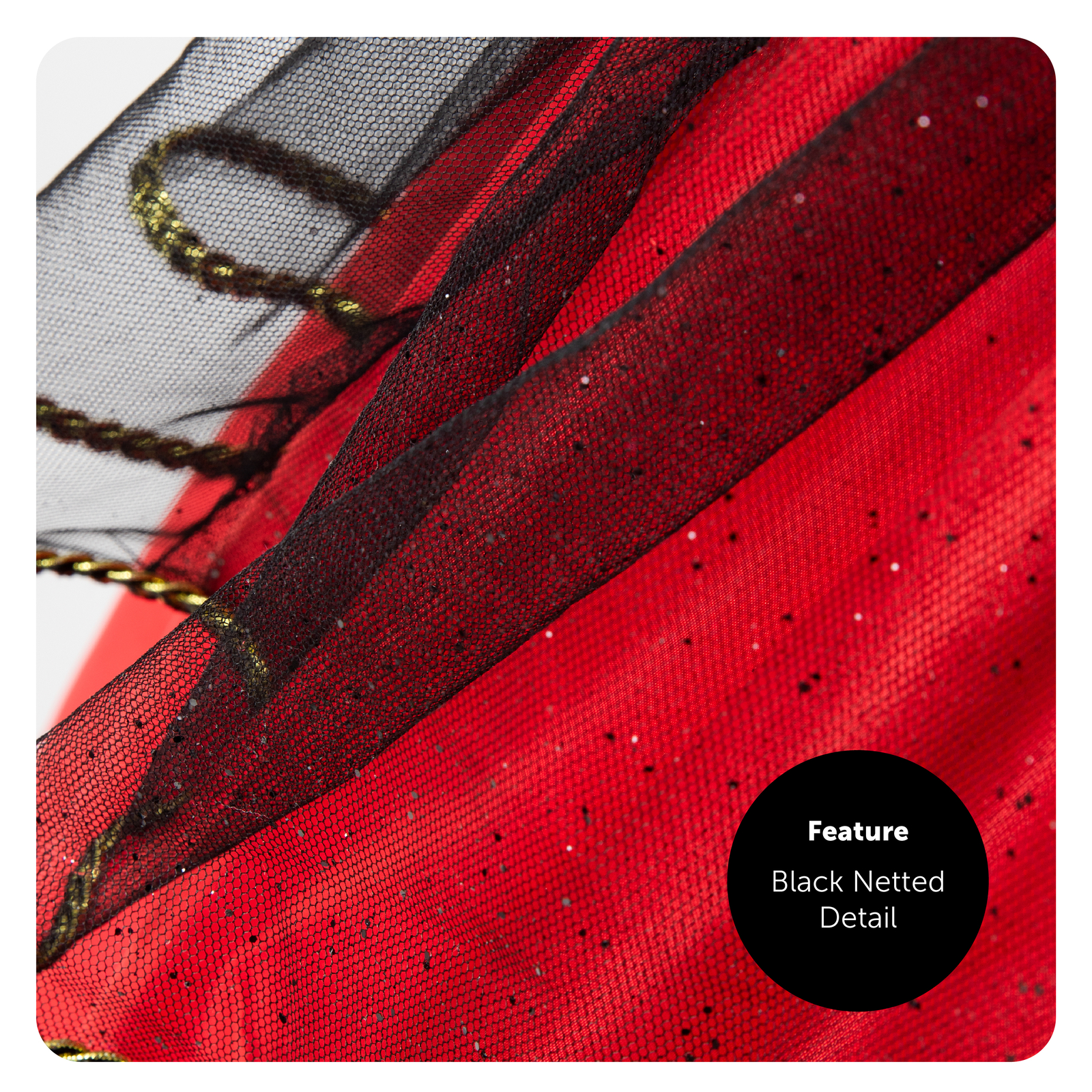 RED HOOPED SATIN SKIRT WITH BLACK GLITTER NET OVERLAY - ADULT SKIRT IS FLOOR LENGTH, CHILDS IS ABOVE THE KNEE