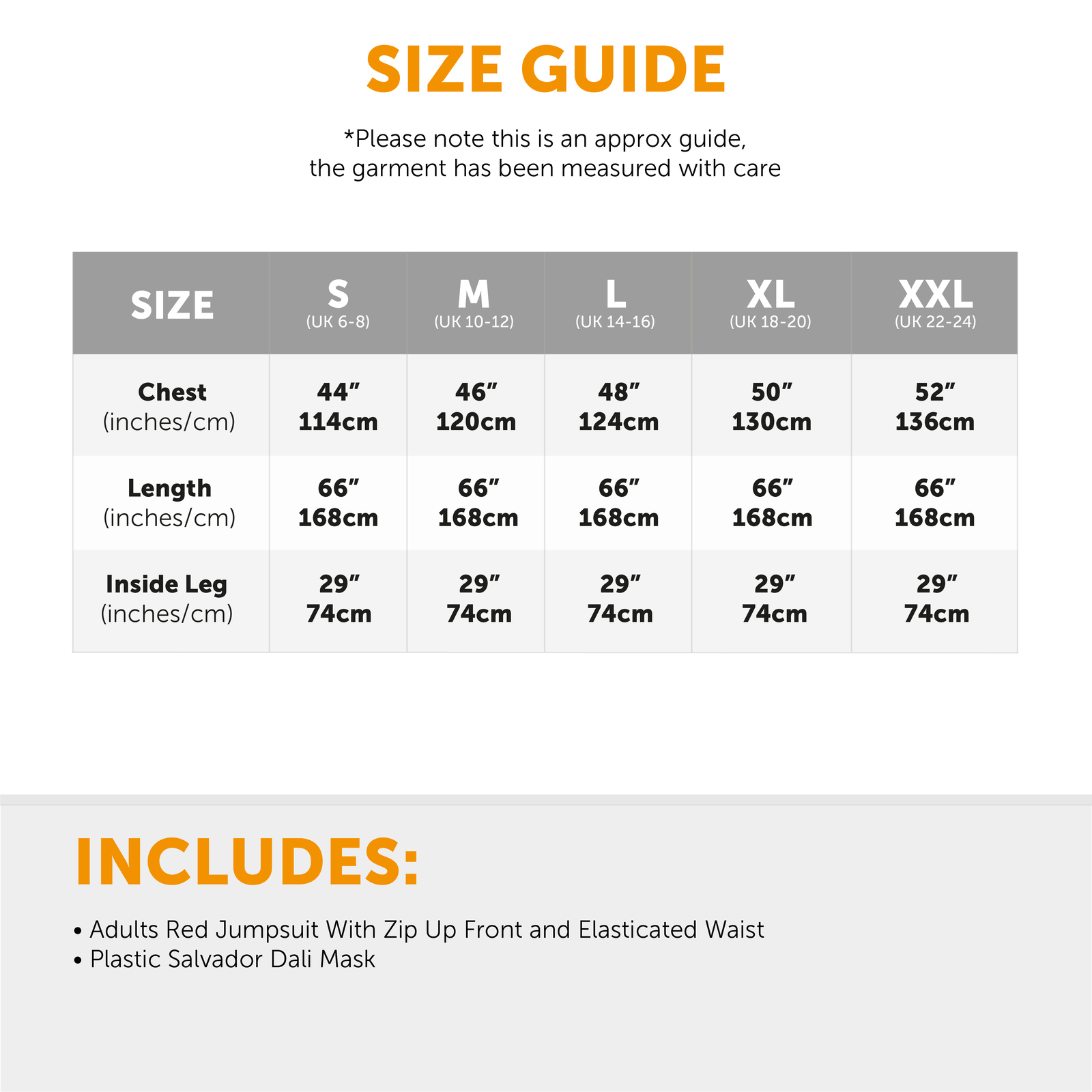 RED MONEY HEIST FANCY DRESS DETAILS: Your Adults Money Heist Costume Set includes a Red Adult sized Money Heist Jumpsuit, Pair Of White Gloves , and a Salvador Dali Mask to complete the look for your next fancy dress party!