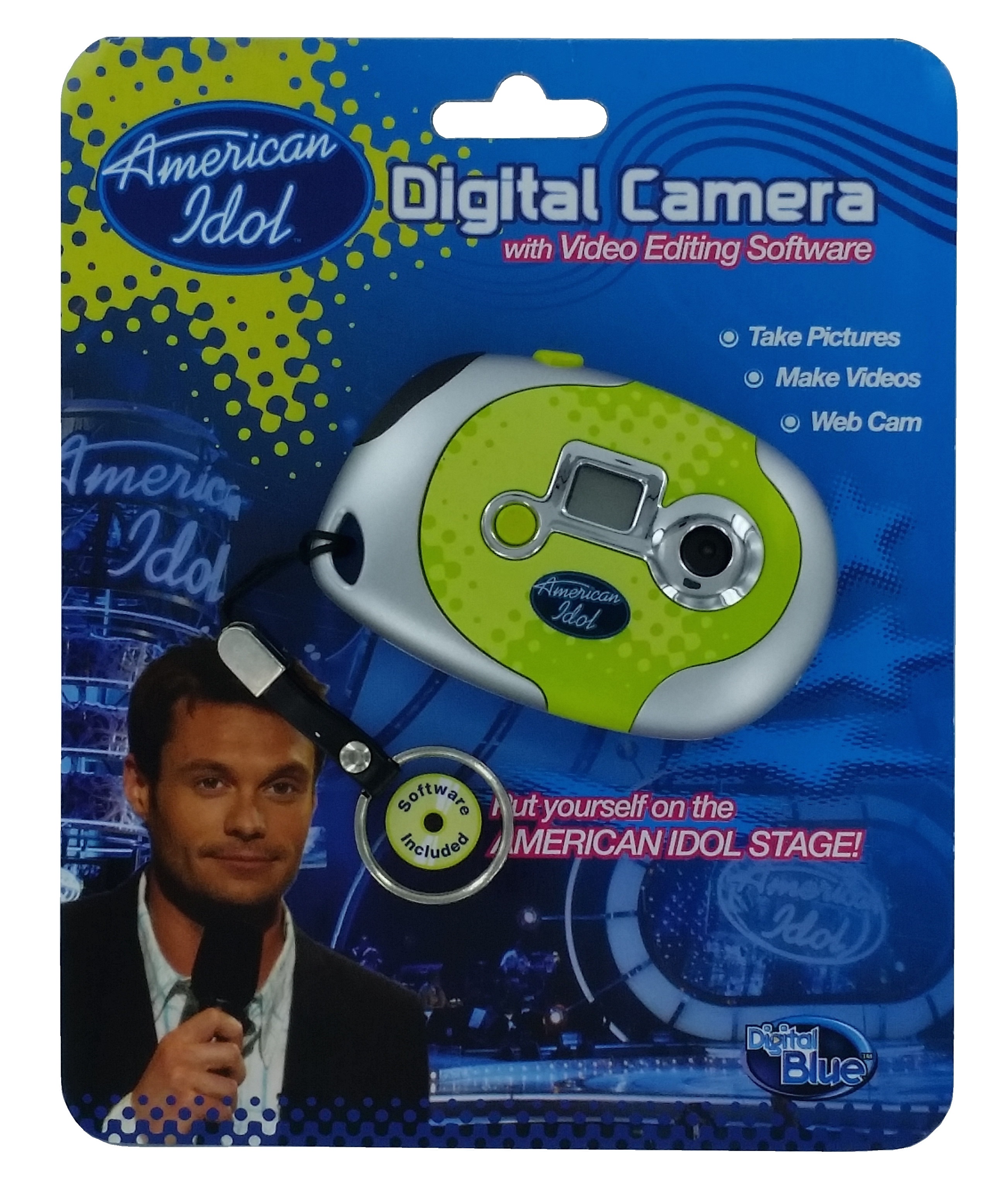 This is the perfect digital camera to hook on your key chain, throw in your pocket and go. Be ready to take pictures any time. Once you have your shots, download into the specially created software and put yourself on the American Idol set just like the stars do! The American Idol Key Chain Camera and Video Editing Software is fully functional on most PCs and comes with all you need to take pictures and edit them using elements from the American Idol television show. This item is NEW.
