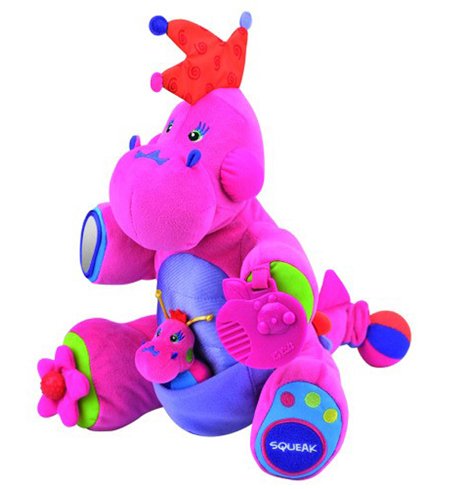 This is Boss in Action's female companion. The plush, well-constructed toy offers numerous activities: squeaking body and feet, crinkly fins, rattling ball, hand with a mirror, clicking flowers, various textures on the body, a waggling tail and a mini baby Boss in her pouch. It provides hours of enjoyment. These toys are machine washable. This item is NEW.
