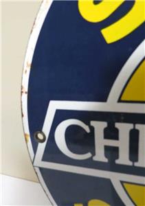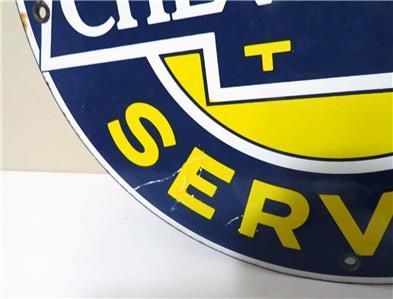 Vintage Ande Rooney CADILLAC AUTHORIZED SERVICE Porcelain Sign 11-1/4" in diameter. Reproduction of the original design made by layering liquified enamels of ground glass crystals onto steel plates and then kiln-firing them. Durable and rust-resistant with lustrous color and finish. Very good condition with a few light scratches. See the photos they are part of description..