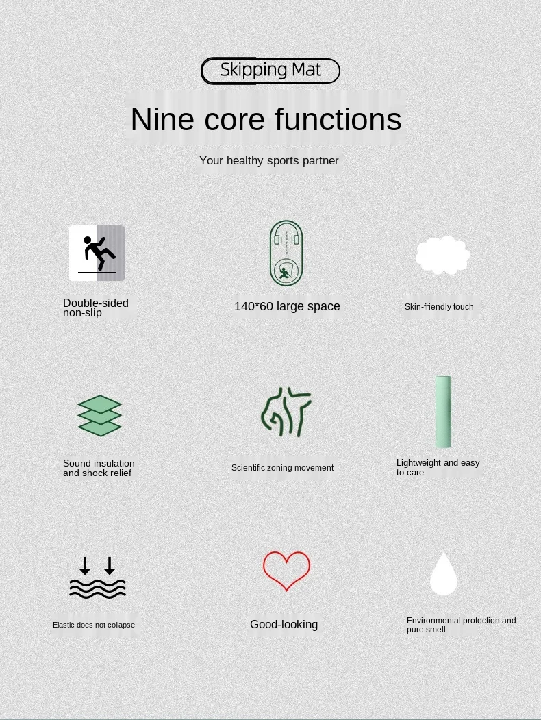 Item:Skipping mat Color: gray/pink/green Size:140X60cm(Please allow 1-3cm error due to manual measurement) Thickness: 6mm Material:TPE Users:Women/Men/Children Features:Easy clean/High quality/Applicable for all age group PS: Support dropshipping and wholesale!