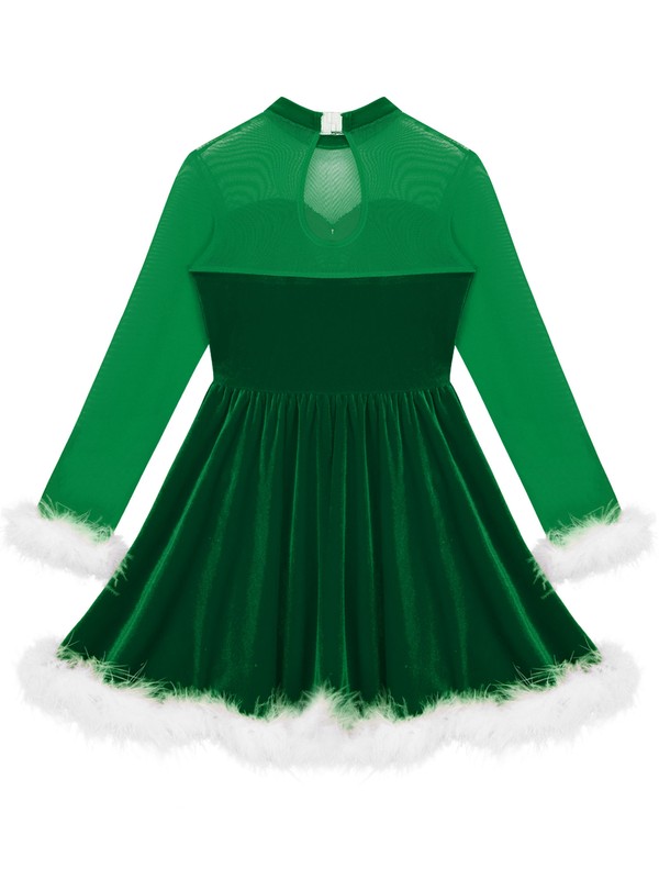 Keyhole back with plastic buckle. Velvet skirt has fluffy feather trim and safety briefs for protecting privacy.