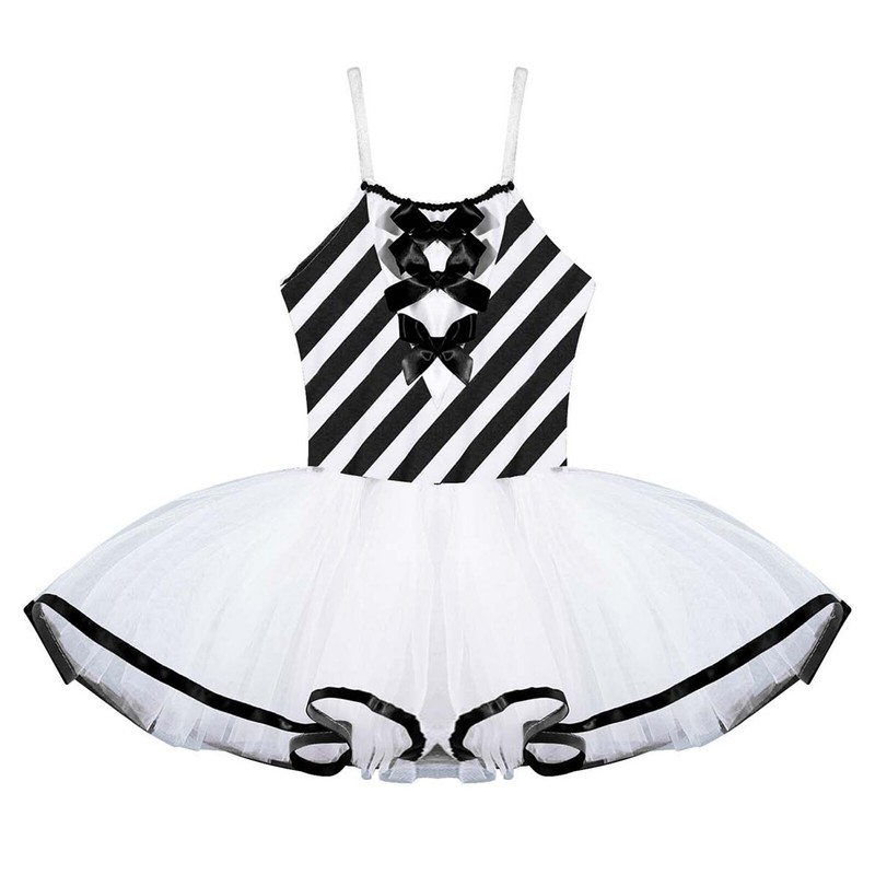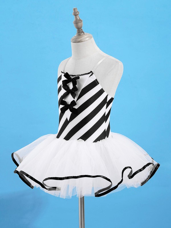 Kids Girls Adjustable Straps Stripes Print Sequins Bowknot Adorned Mesh Tutu Dress Dance Jumpsuit.