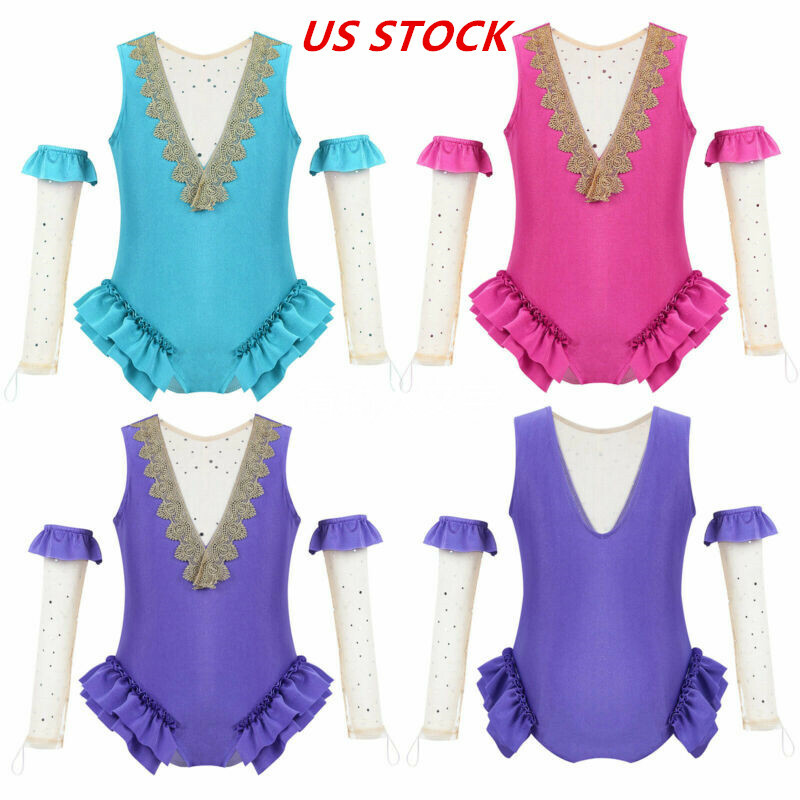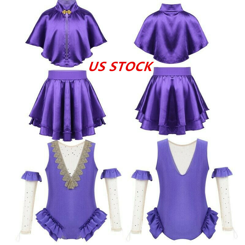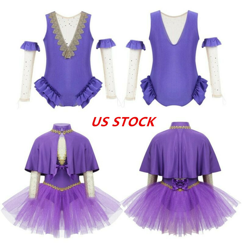 Kids Girls Asymmetrical Shoulder Mesh Leotard Dress with Headband for Party Stage Performance.