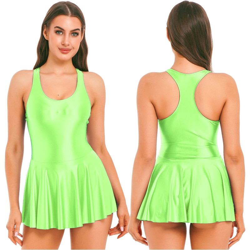 Sexy Women's Sleeveless U Neck Tank Skater Dress Oily Glossy Pleated Mini Dress