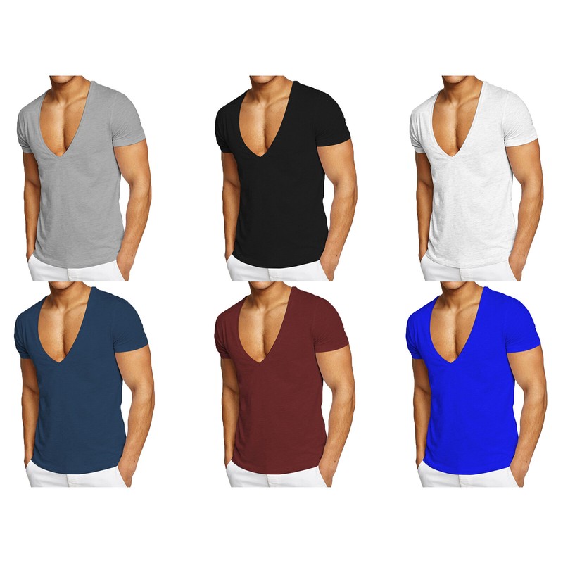 Short sleeve, deep v neck, solid color. Slim fit and good elastic design fully shows off your muscle line.