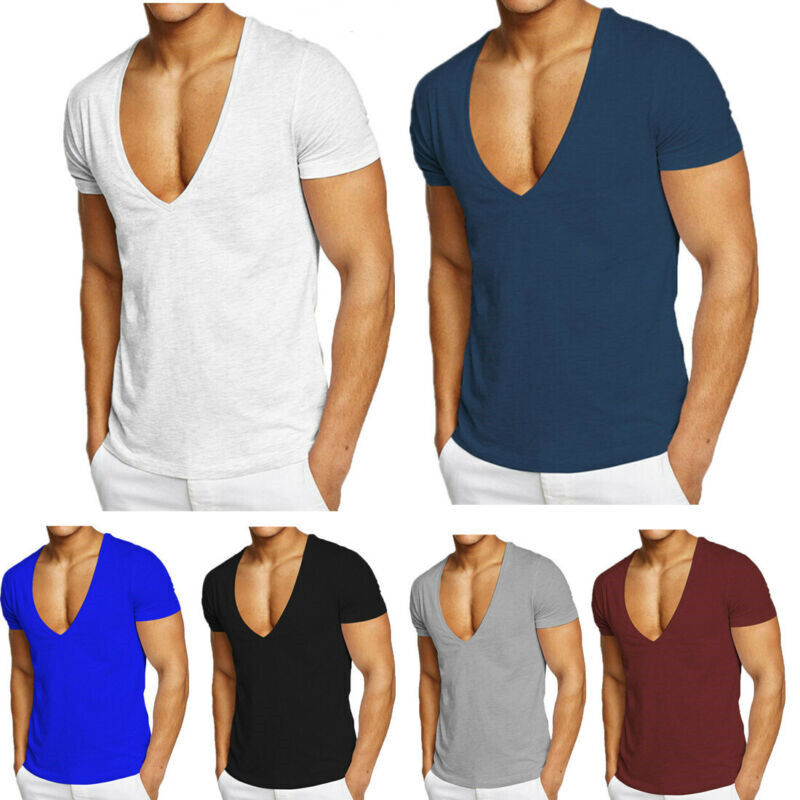 Mens casual sports solid color T-shirt short sleeve deep v neck slim fit office workout tops.