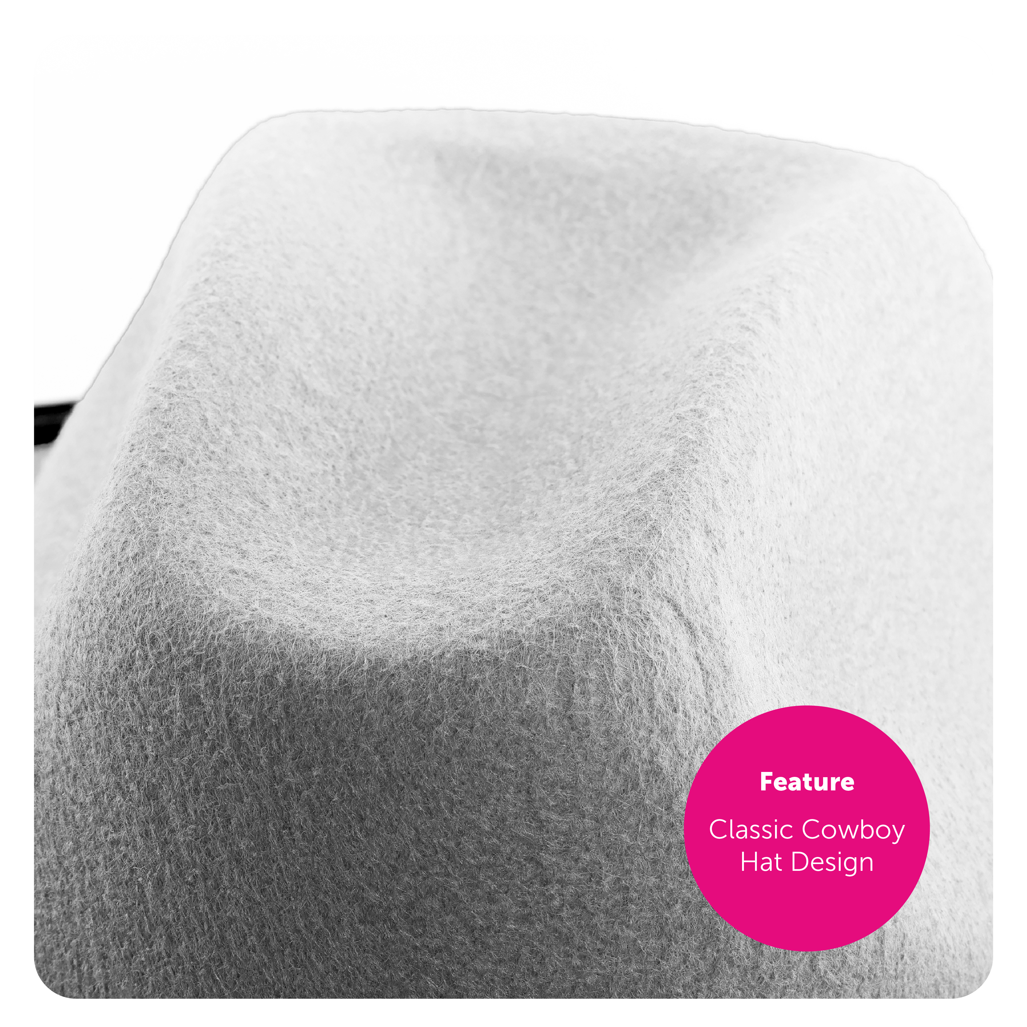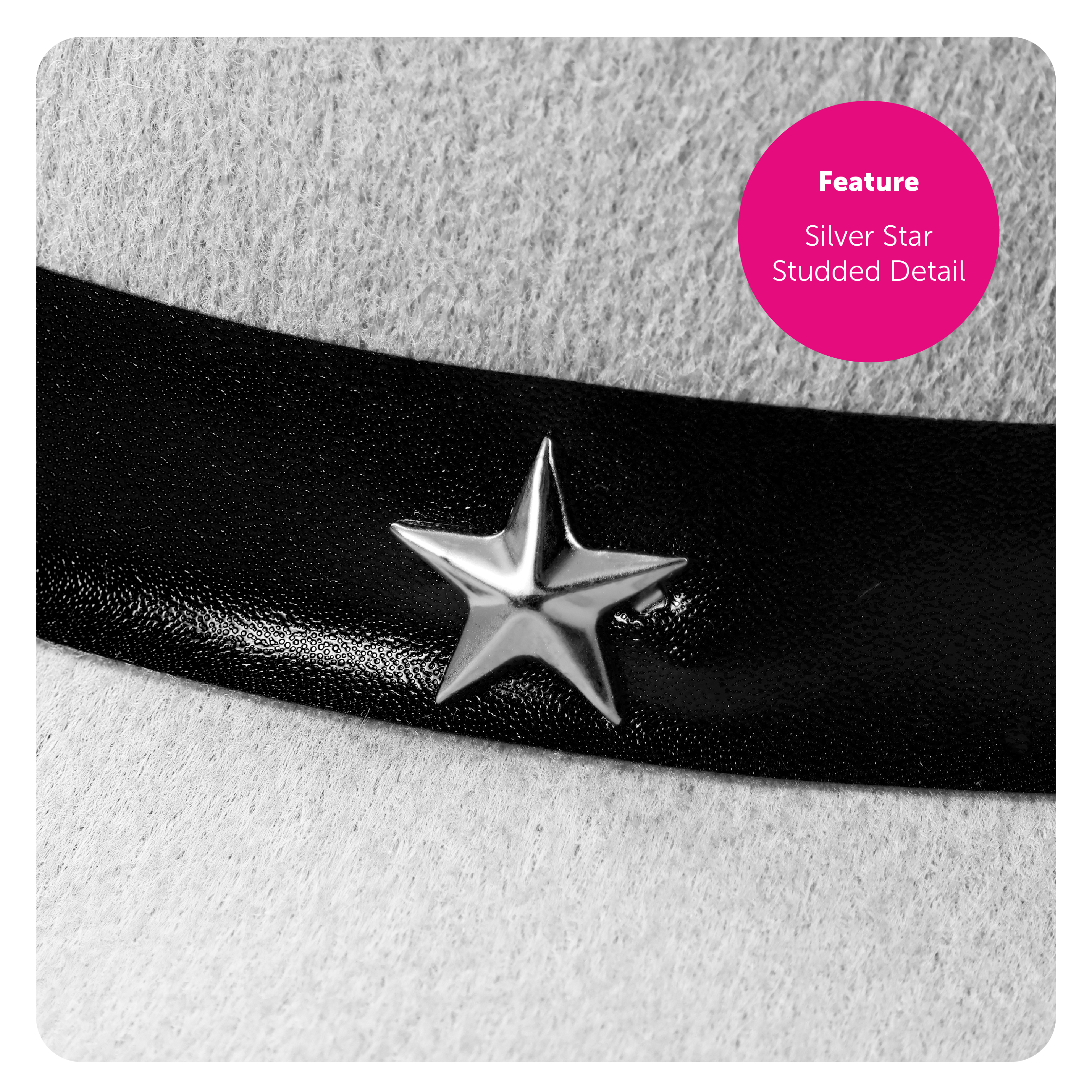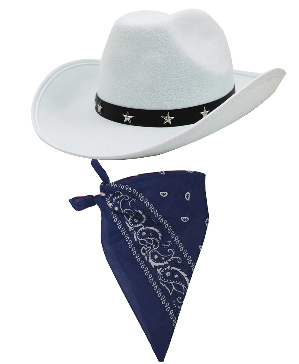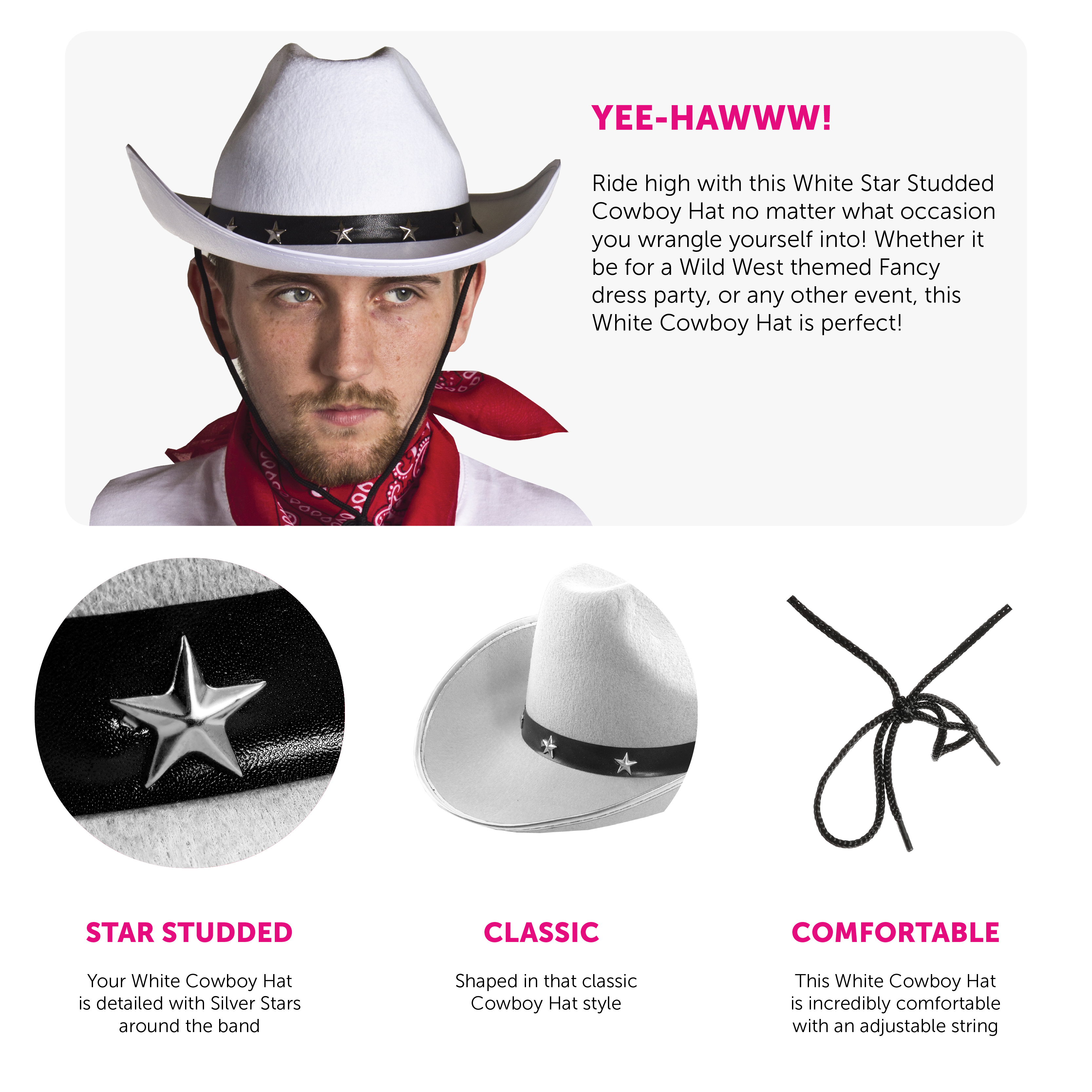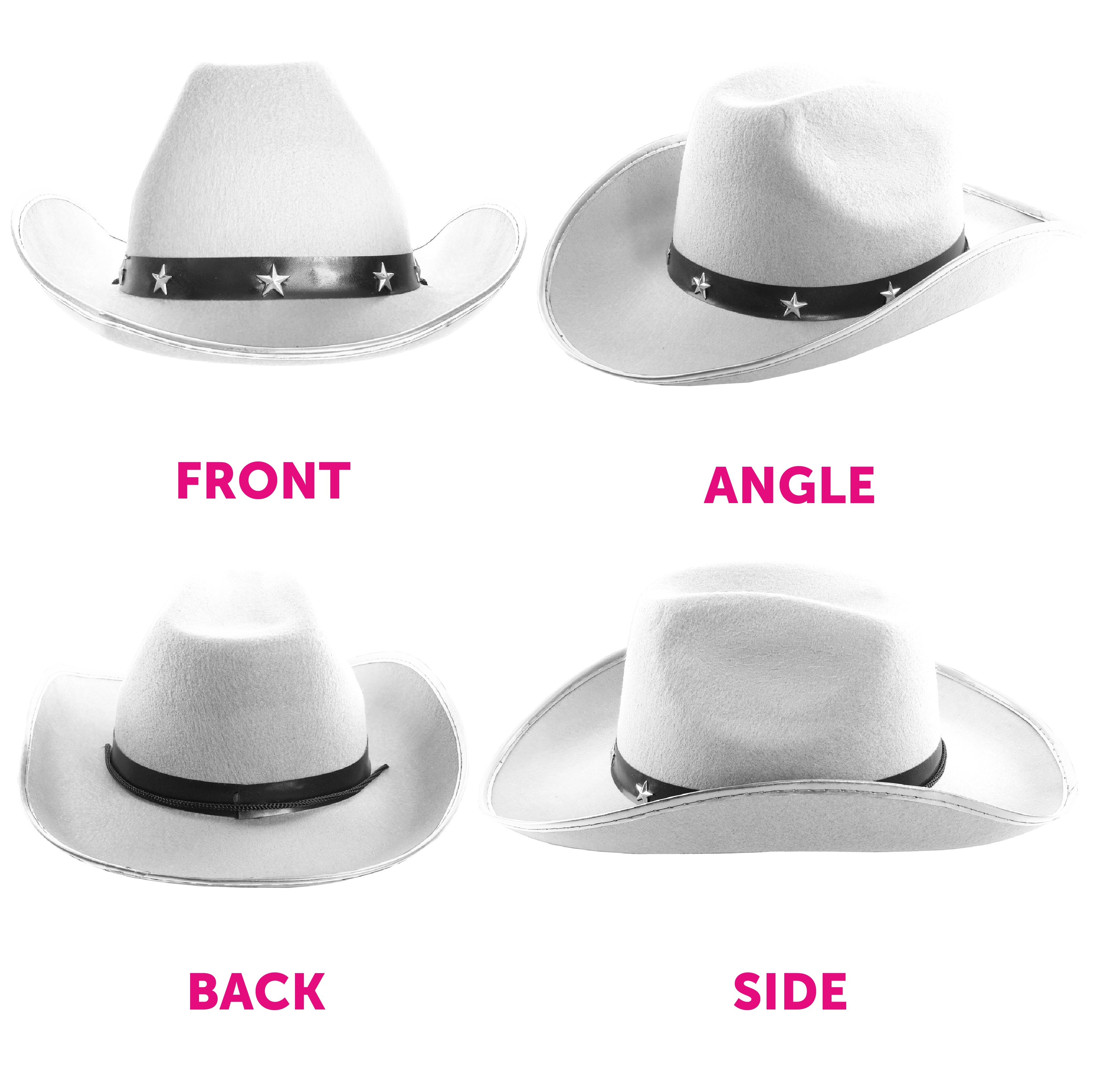 QUALITY WHITE FELT COWBOY HAT WITH SILVER STAR STUDDED BAND AND ADJUSTABLE NECK STRAP TO SECURE
