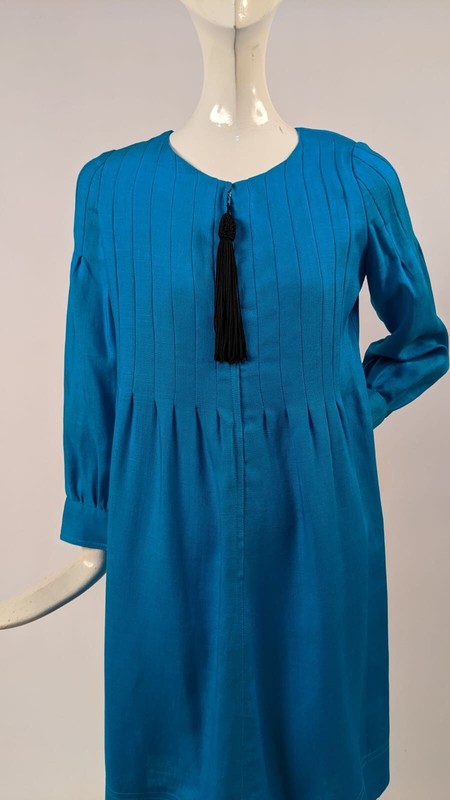IN A BLUE LINEN BLEND WITH PLEATING ON EACH SIDE OF THE FRONT AS WELL AS PLEATING ON THE TOP SLEEVES THAT OPEN TO FULLNESS THROUGH THE ARM WITH A ROUNDED BAND CUFF BUTTONING CLOSED. STITCHING IS DONE IN A SLIGHTLY LIGHTER BLUE TONE AND DETAILS ALL THE SEAMS OF THE SIDES, BOTTOM, AND PLEATED REAR AS WELL AS THE CUFFS.