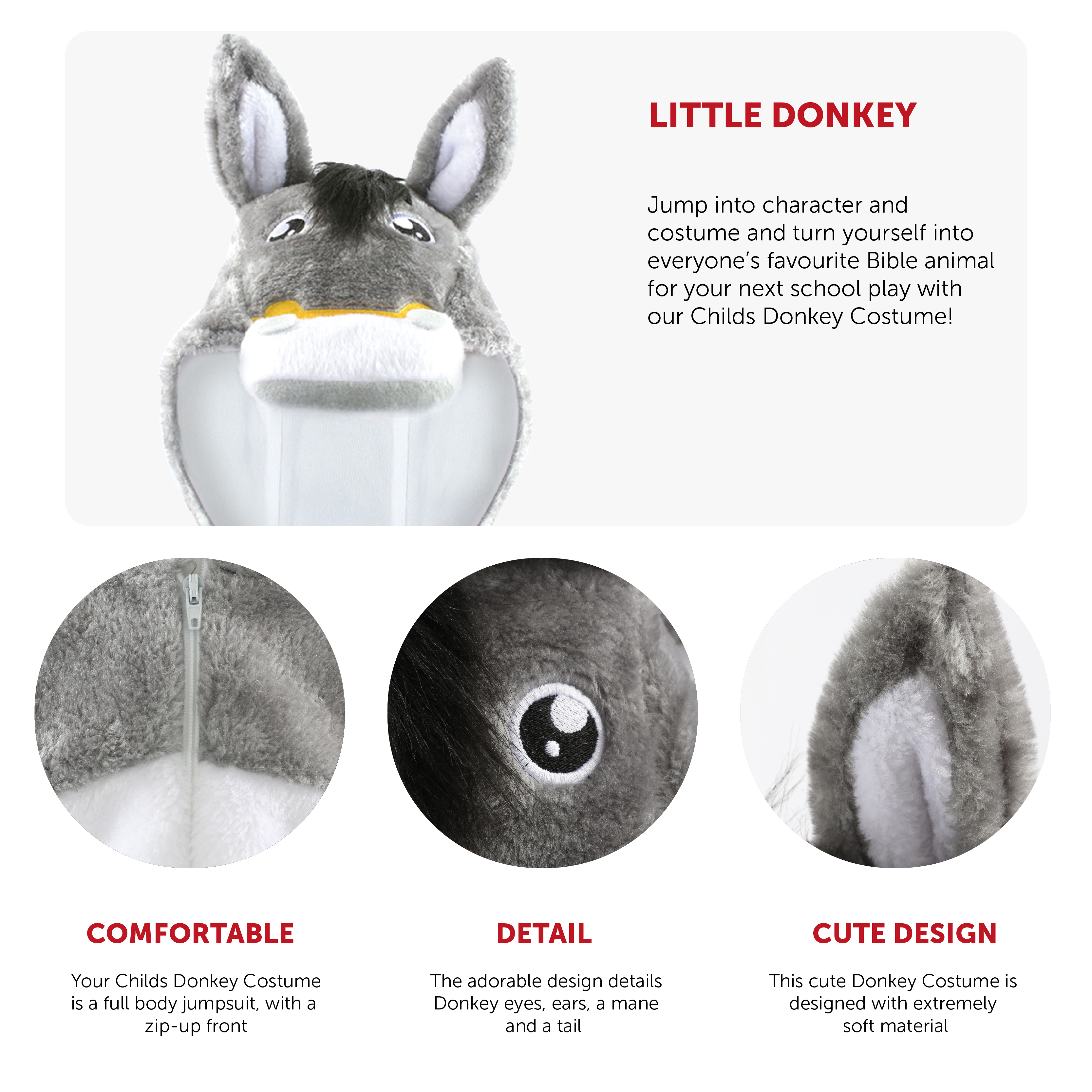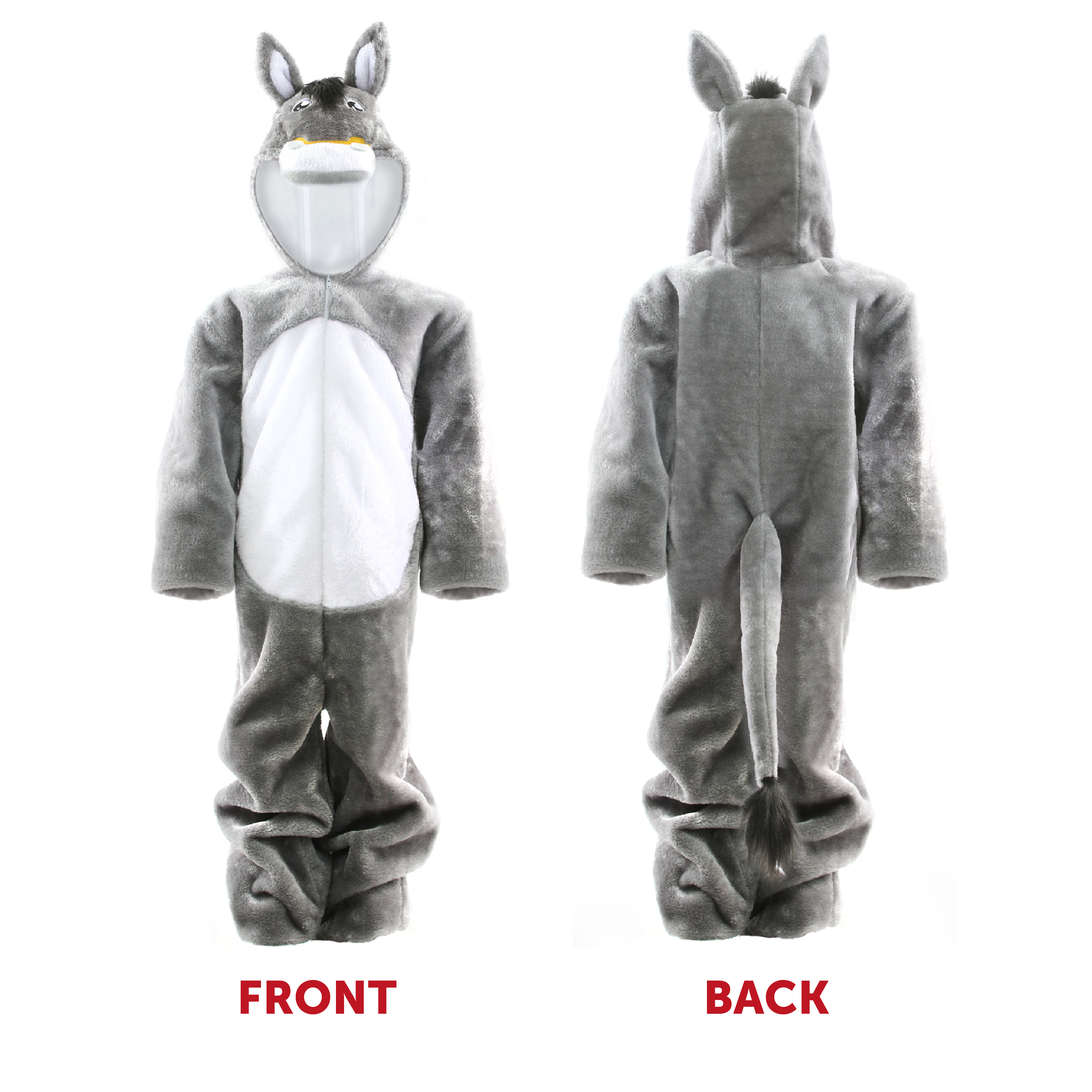 DONKEY COSTUME DETAILS: Your Childs Donkey Costume is a full body jumpsuit with a Donkey head hood, detailing Donkey eyes, Donkey Ears, and a Donkey Mane and Tail, with a zip-up back to jump in and out of comfortably!