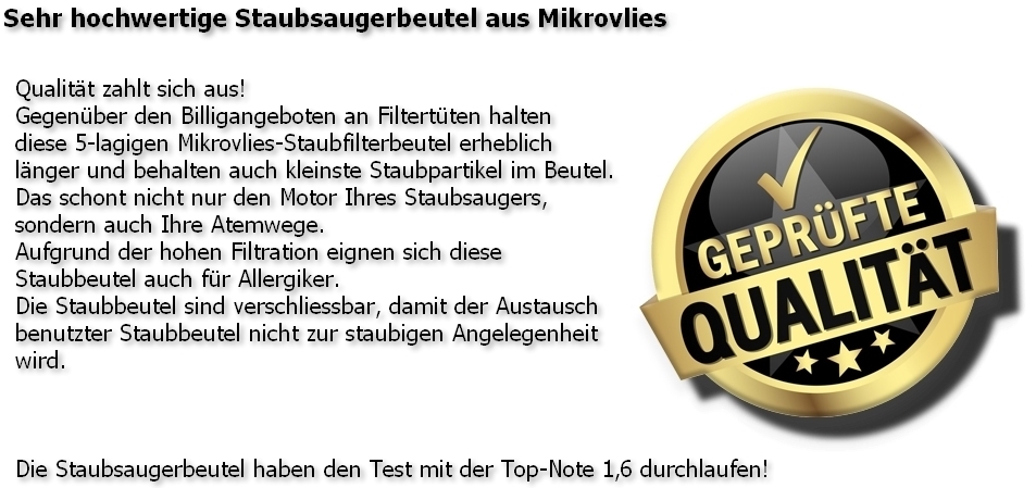 Premium Qualität * 5 Lagen Vlies * Hohe Filtration * Für Allergiker geeignet * Umweltfreundlich * Verschliessbar * Maximale Saugleistung