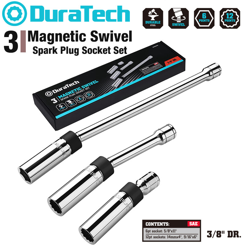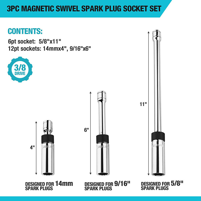 SPECIFICATIONS: 3PC 360 degree swivel 5/8", 14MM, 9/16" socket set with 6-Point and 12-Point, Cr-V steel, magnetic core. Total Length: 4 inch, 6 inch and 11inch, Drive Tang: 3/8 inch