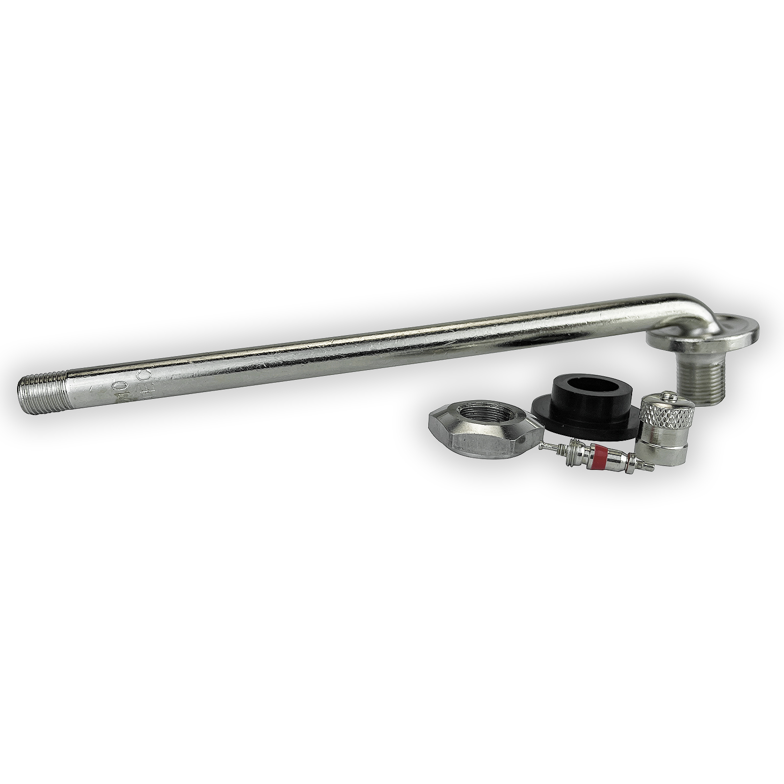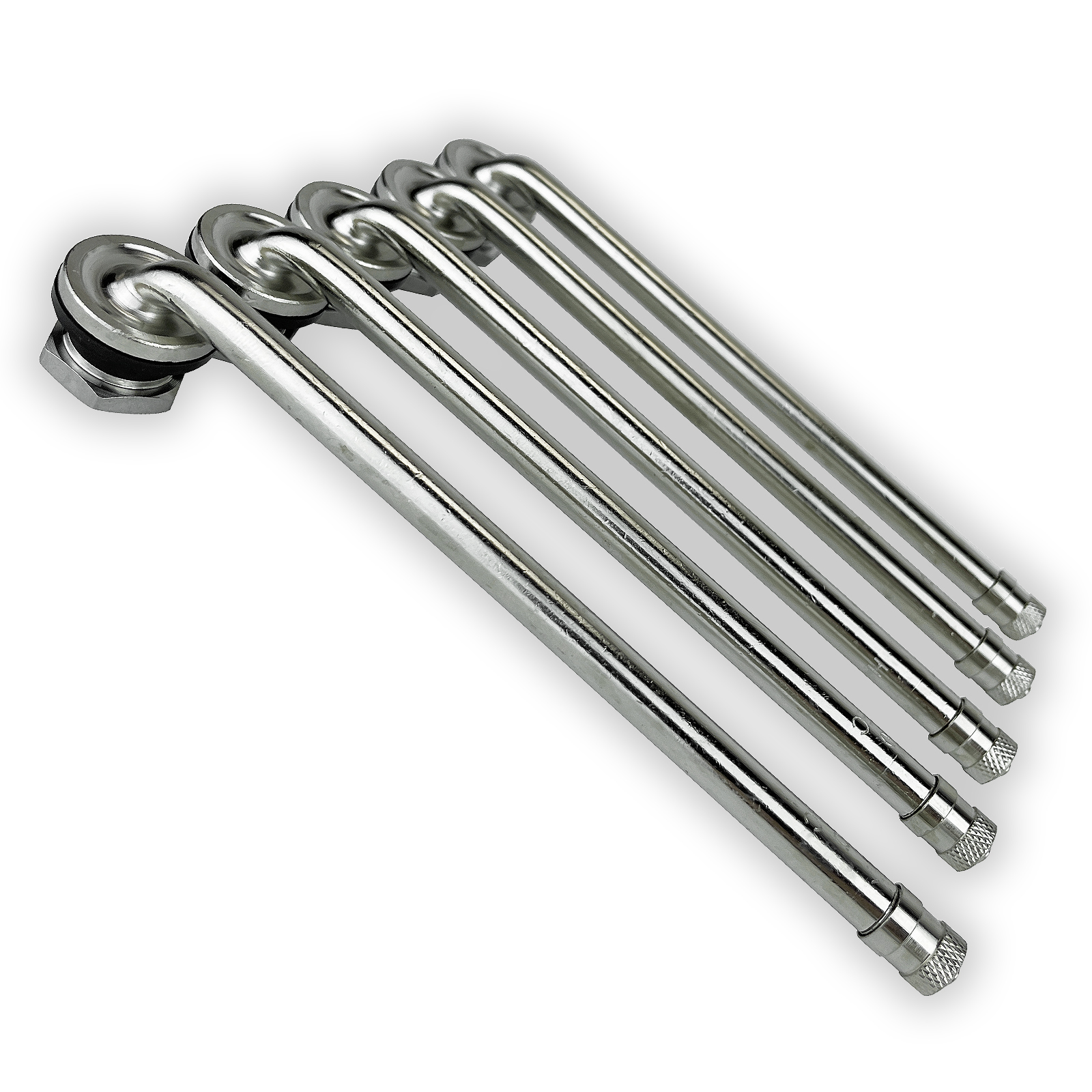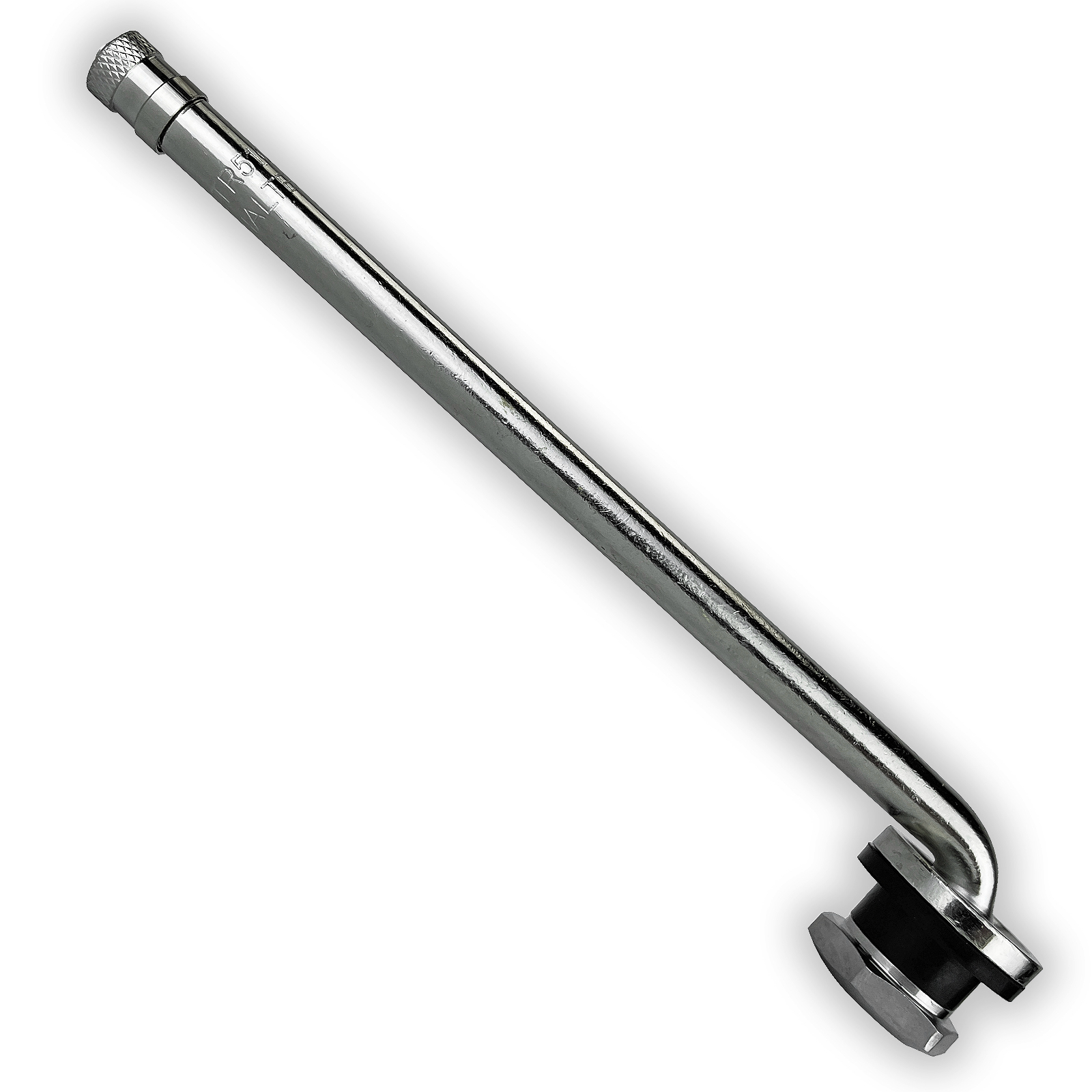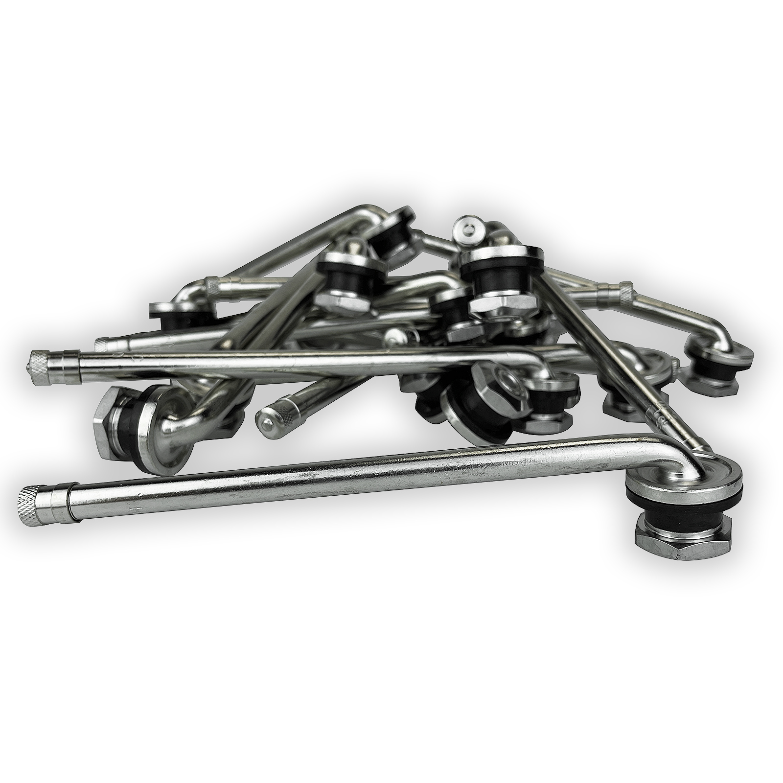 Haltec's TV-510 90 degree 5 1/2 inch long bent nickel plated clamp in tubeless valve stems are rigorously tested and designed for use in commercial applications. These are designed for use with drop-center aluminum disc wheels and fit all standard 5/8 inch (0.625 inch) valve stem holes. Haltec's TV-510 valve stems are equipped with EPDM grommets and high temp valve cores.