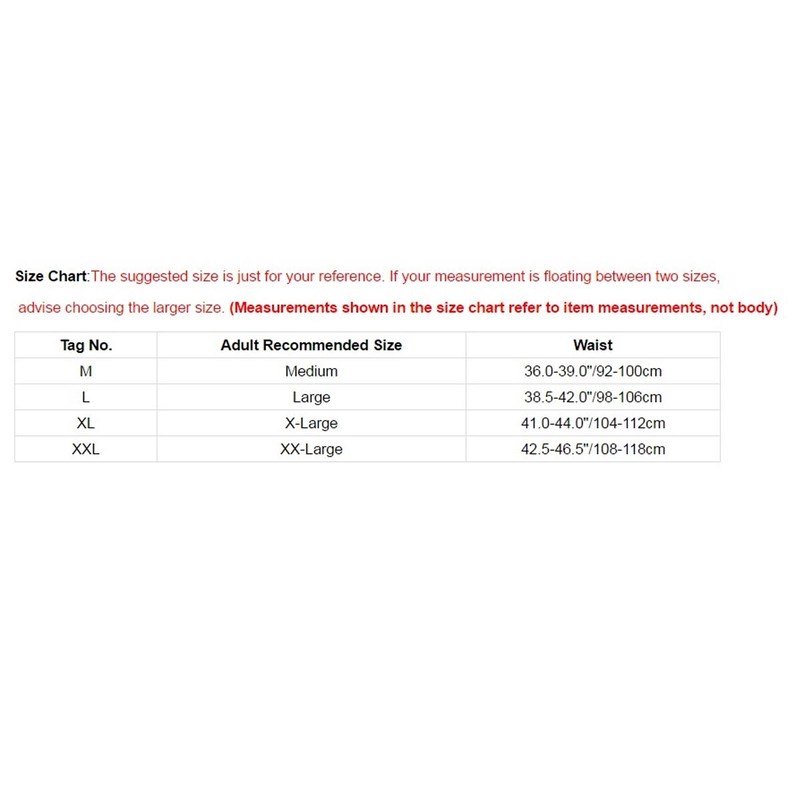 Tag No.Adult Recommended SizeWaistMM27.0-39.0"/68-100cmLL28.0-41.0"/72-104cmXLXL30.0-42.5"/76-108cmFriendly Tips: The size is measured by hands, please allow minor error of measurement. Photo color might be a little different from the actual product due to color display of different monitors.