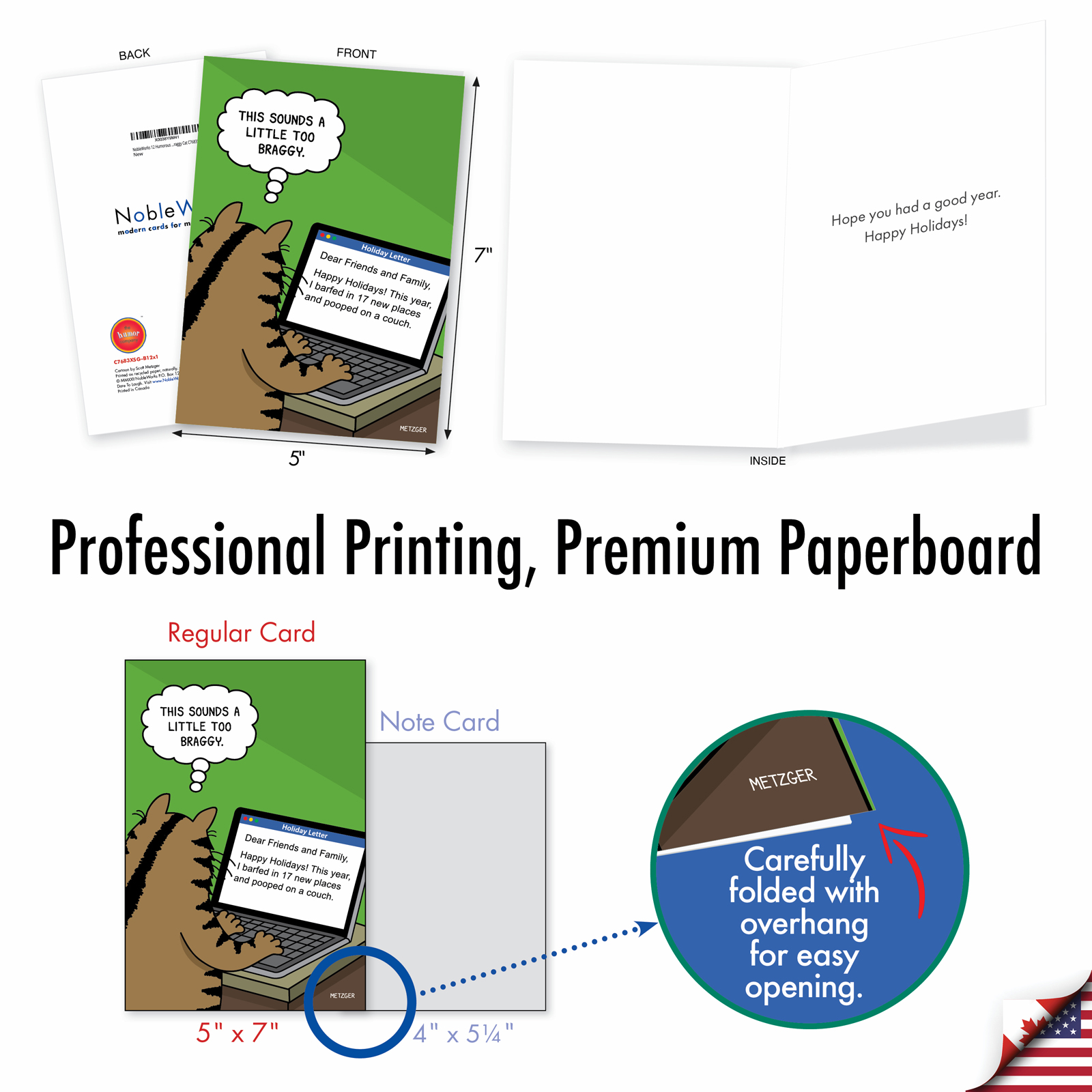 "Our good as gold cards are printed on thick, snow white cardstock. All of our notecard sets are made of recycled material (not papyrus, naturally). Our print on demand technology further reduces paper waste and environmental impact. The high gloss cover photo pops with quality and color, while the inside is matte, creating a smooth writing surface for your heartfelt, joyful all-occasion notes. This year, reach friends, family, and coworkers living near or far, as every greeting card ships with a mailing envelope. Bulk notecard assortments and sets arrive in a reusable box. All boxed notecard sets are easily stored in a work office desk, ready to customize for your next life occasion. This year, leave a big impression on your recipient, no matter the occasion. NobleWorks, and The Best Card Company, have beautiful designs and funny greetings waiting for you! ORDER NOW!"