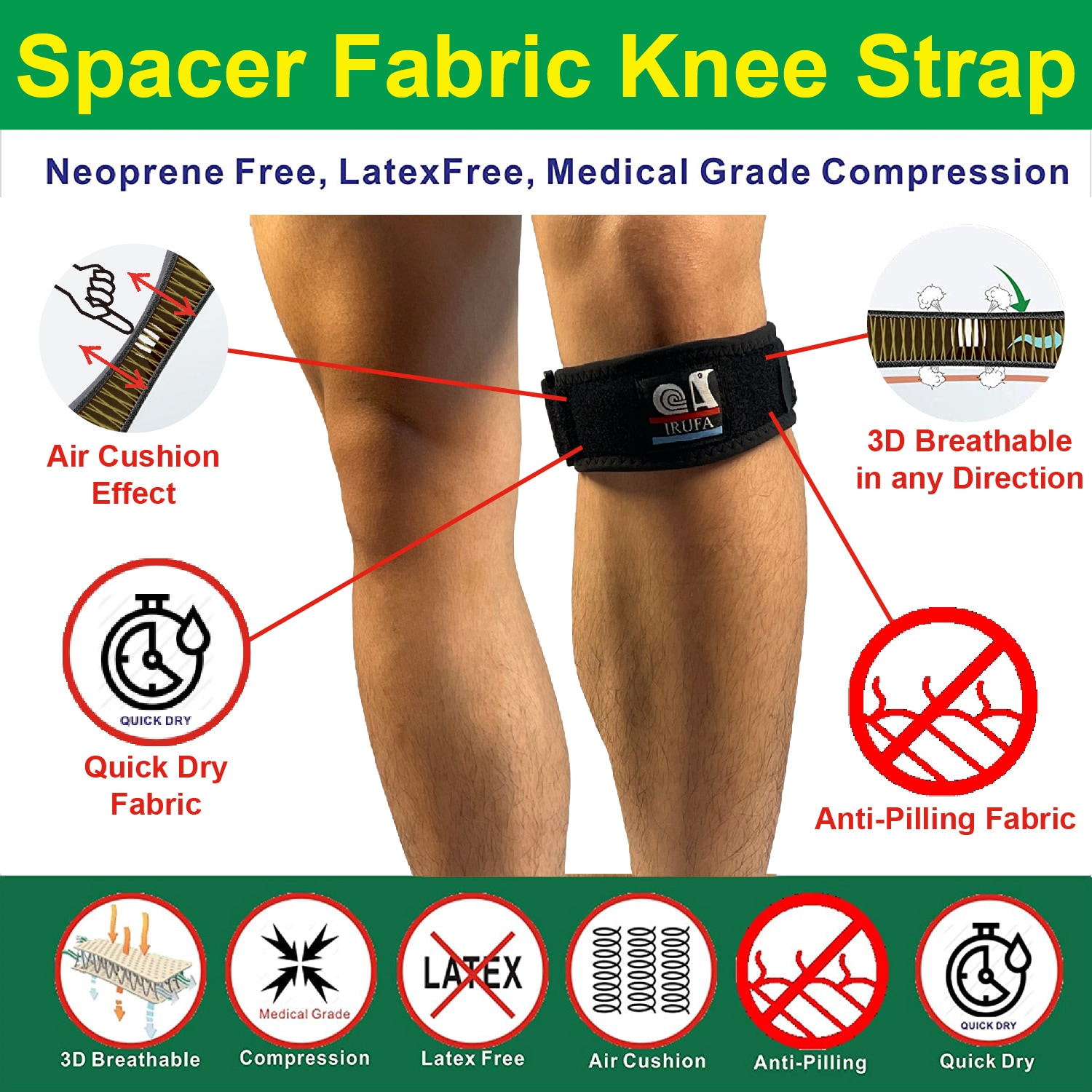 Patented Material : Our knee strap is made by patented Spacer Fabric which has medical grade compression strength and without latex contained. Therefore, our knee strap has enough compression strength to protect your knee without allergy problem. Besides, our Spacer Fabric is 3D breathable in any direction which helps you comfort use for all day.