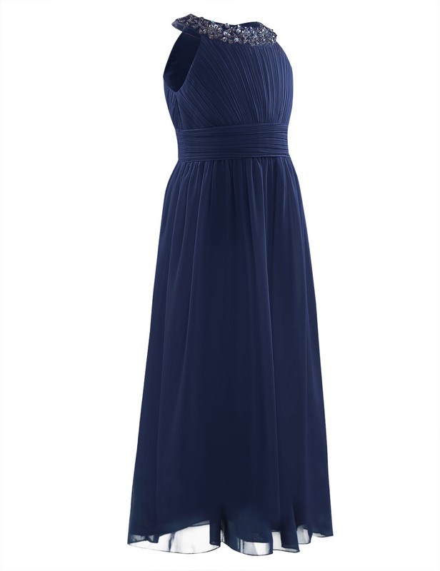 Front neckline is decorated with sequins and beads, pleated top bodice. Pleated high-waisted design, hidden back zipper closure.