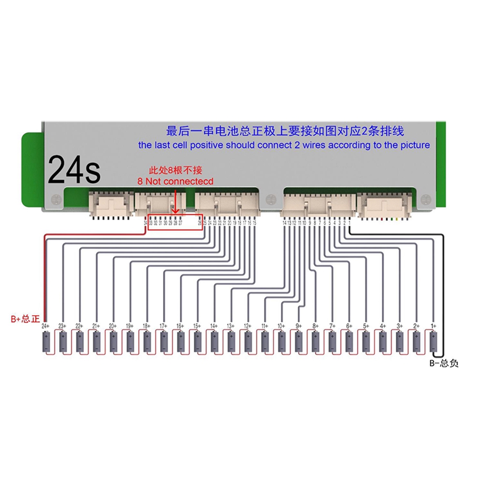 Then start from the black wire and start from the first white wire from right to left to the first cell, second cell, third cell of the battery and so on, and connect to the positive electrode of each cell in sequence. The minimum number of cells to be connected is 10S, and the batteries of less than 32S are not left empty. After connecting, use a multimeter to measure the voltage on the plug row. There is no problem to confirm that the voltage is correct before plugging into the protection board The same wire is connected to a red wire, regardless of its color), note that the last red wire on the third and last socket is B + which supplies power to the protection board. It is connected to the cable of the last cell of batteries. That is to say, two wires need to be connected to the bms on the last positive pole of the battery. There is a hole behind the last red wire of the third socket and B + is redundant. You can leave it alone. Other instructions are the same as the 24S BMS