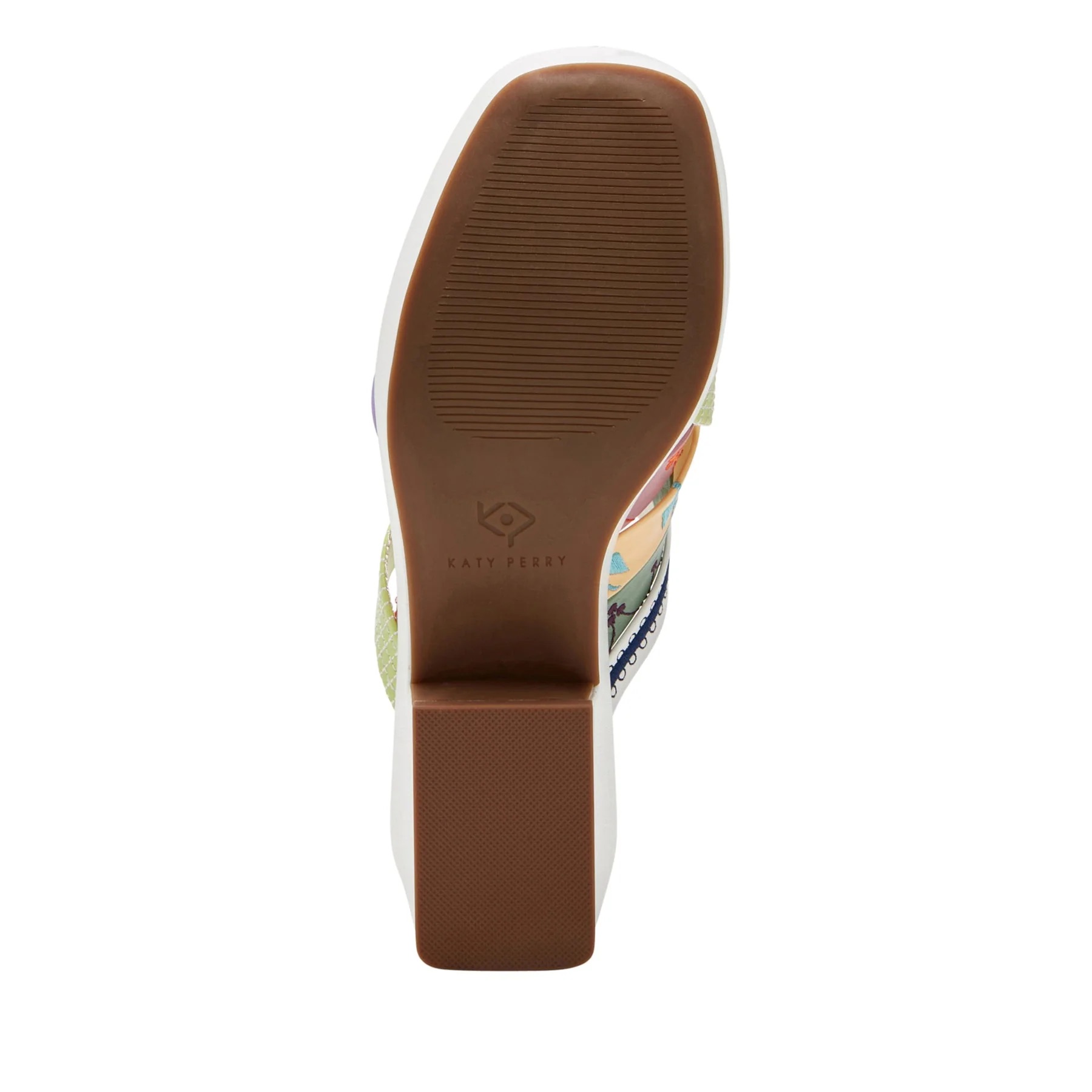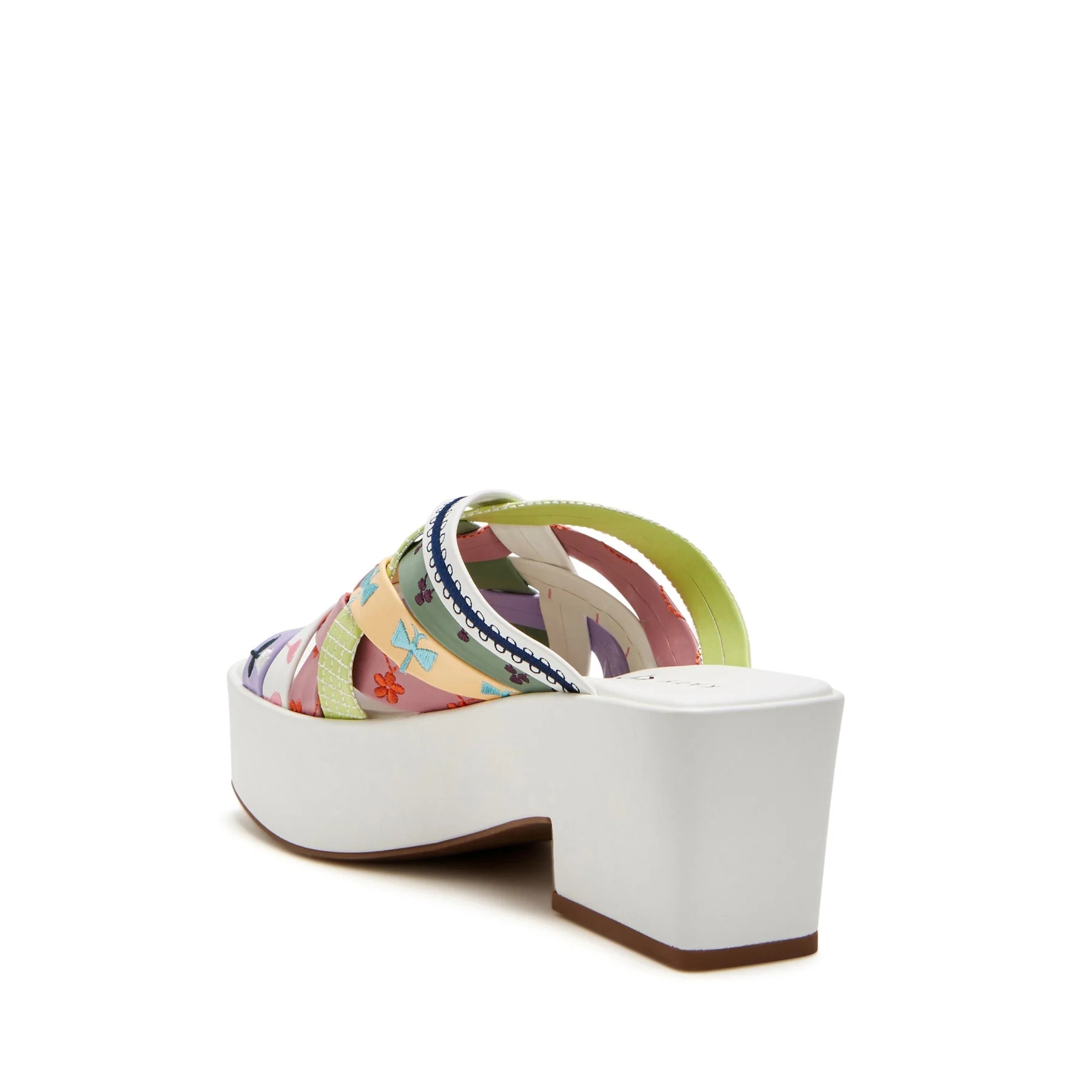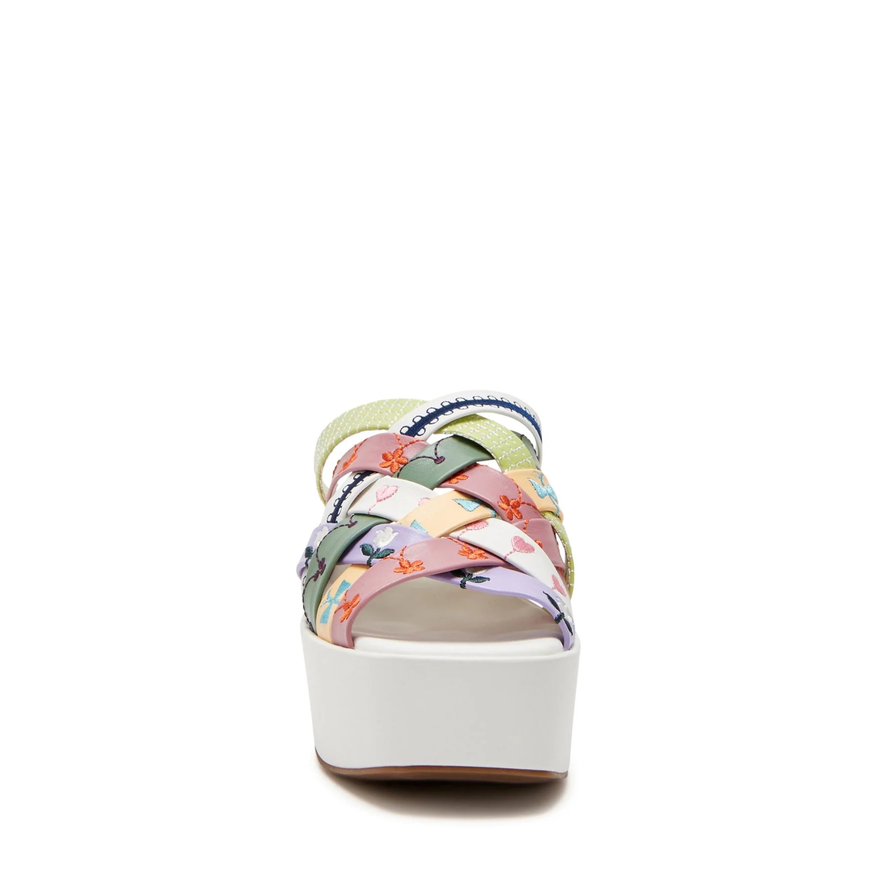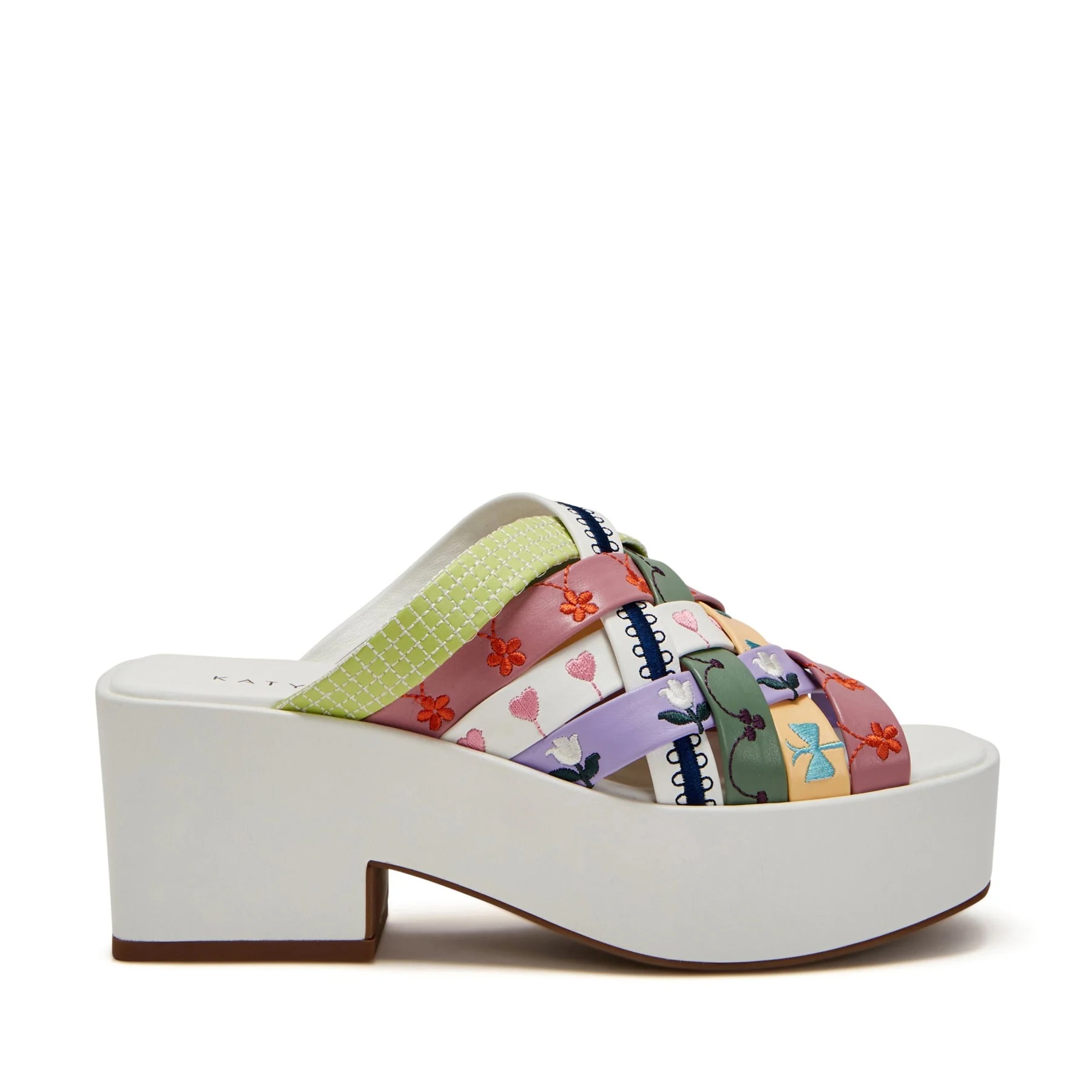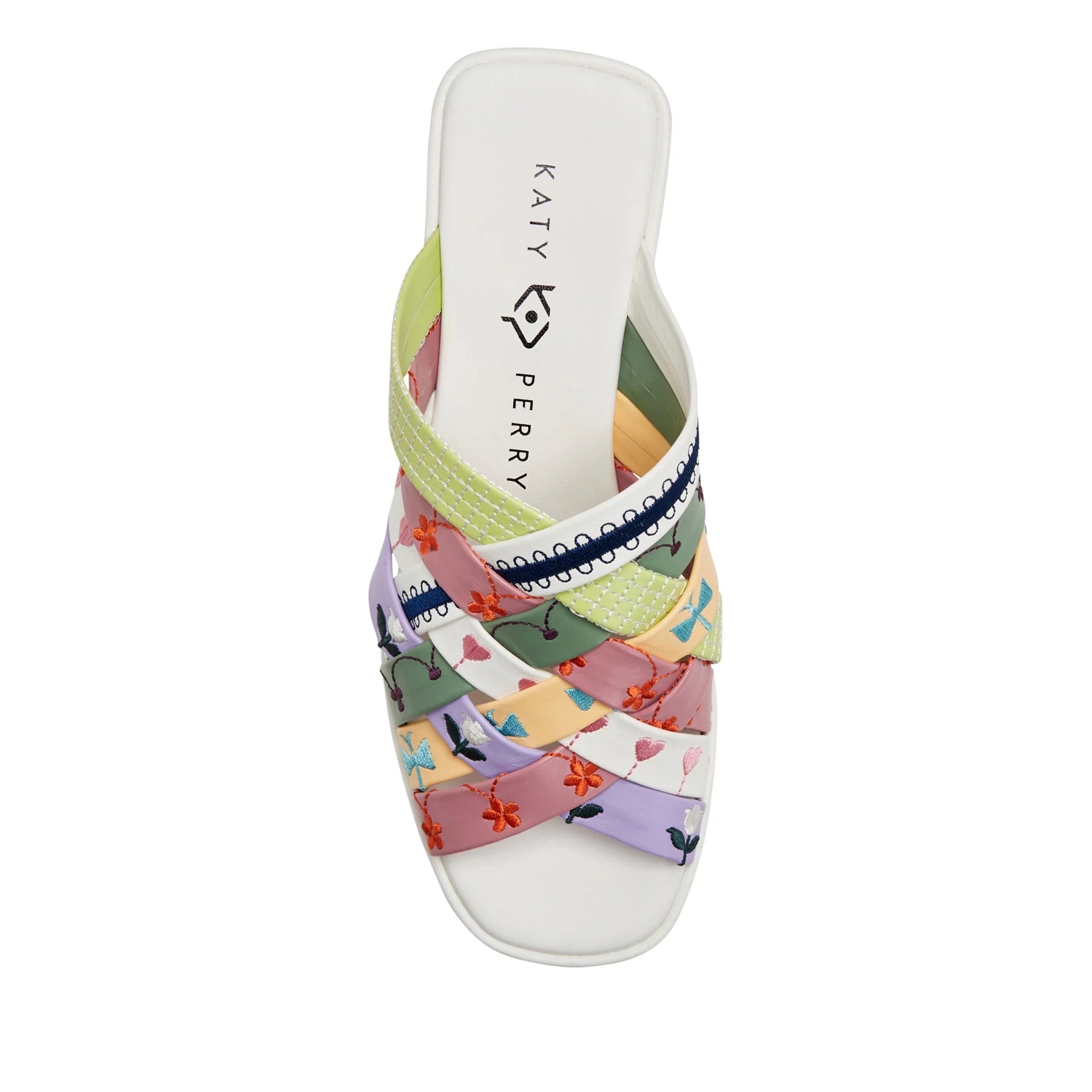 The Busy bee criss cross slide in Soft Nappa with embroidery by Katy Perry features a round toe lofted on a modern platform heel with braided straps.
