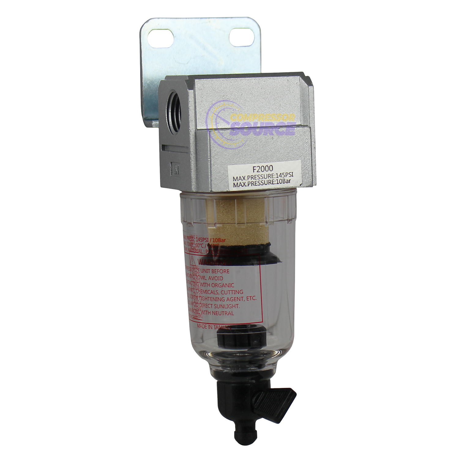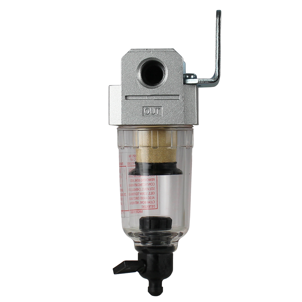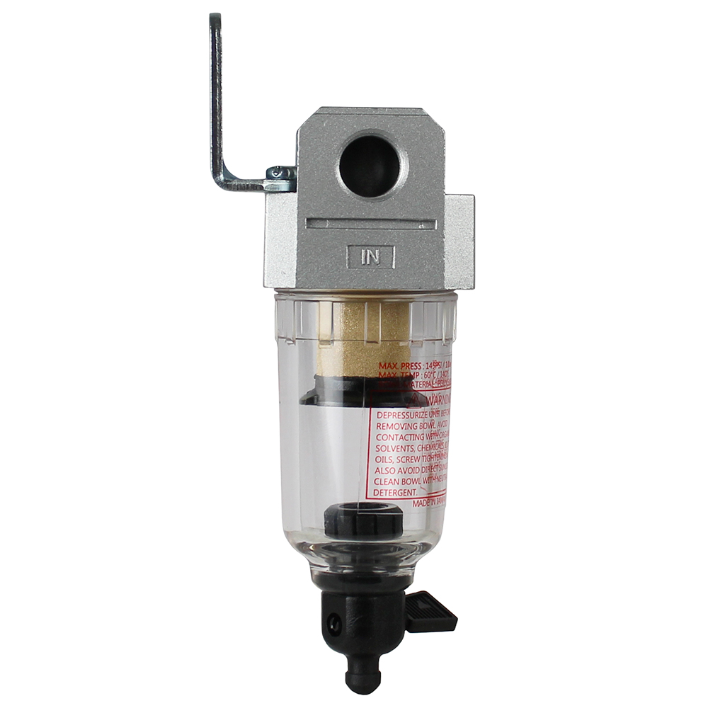 Upgrade your air system with this 1/4" compressed air in-line moisture filter separator. Designed to remove water droplets and debris from your air lines, this compact unit helps protect your tools, reduce maintenance, and ensure cleaner compressed air for every job. It features a durable polycarbonate bowl with a clear sight window, a manual drain valve for quick moisture removal, and an included wall mounting bracket for easy installation. A directional flow arrow is stamped into the housing to ensure proper airflow during setup. Ideal for garages, workshops, and industrial air systems, this filter is a reliable choice for anyone using pneumatic tools or blow guns.