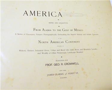 A Series of Panoramic Pictures Photographically Delineating the Superb Natural and Artistic Features of the North American Continent including its' Historic Shrines, Industrial Hives, Urban and Rural Life, Lake, River, and Mountain Scenery, and Wealth of other Picturesque Landscape Beauties. Edited by PROF. Geo. R. Cromwell New York James Clarke, 45 Vesey St. Publisher This is a huge book but the pages aren't numbered. Very clean inside no missing pages but the binding has some wear and splitsSee the photos they are part of the description.