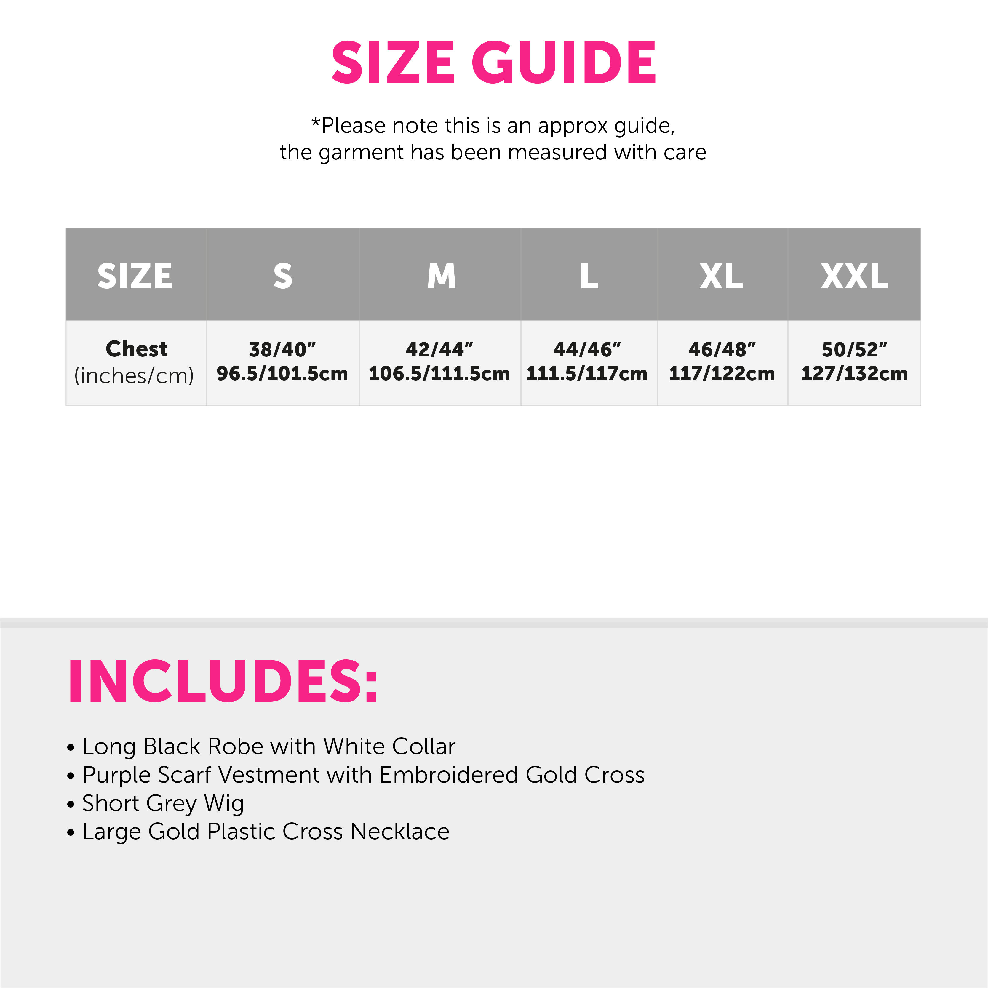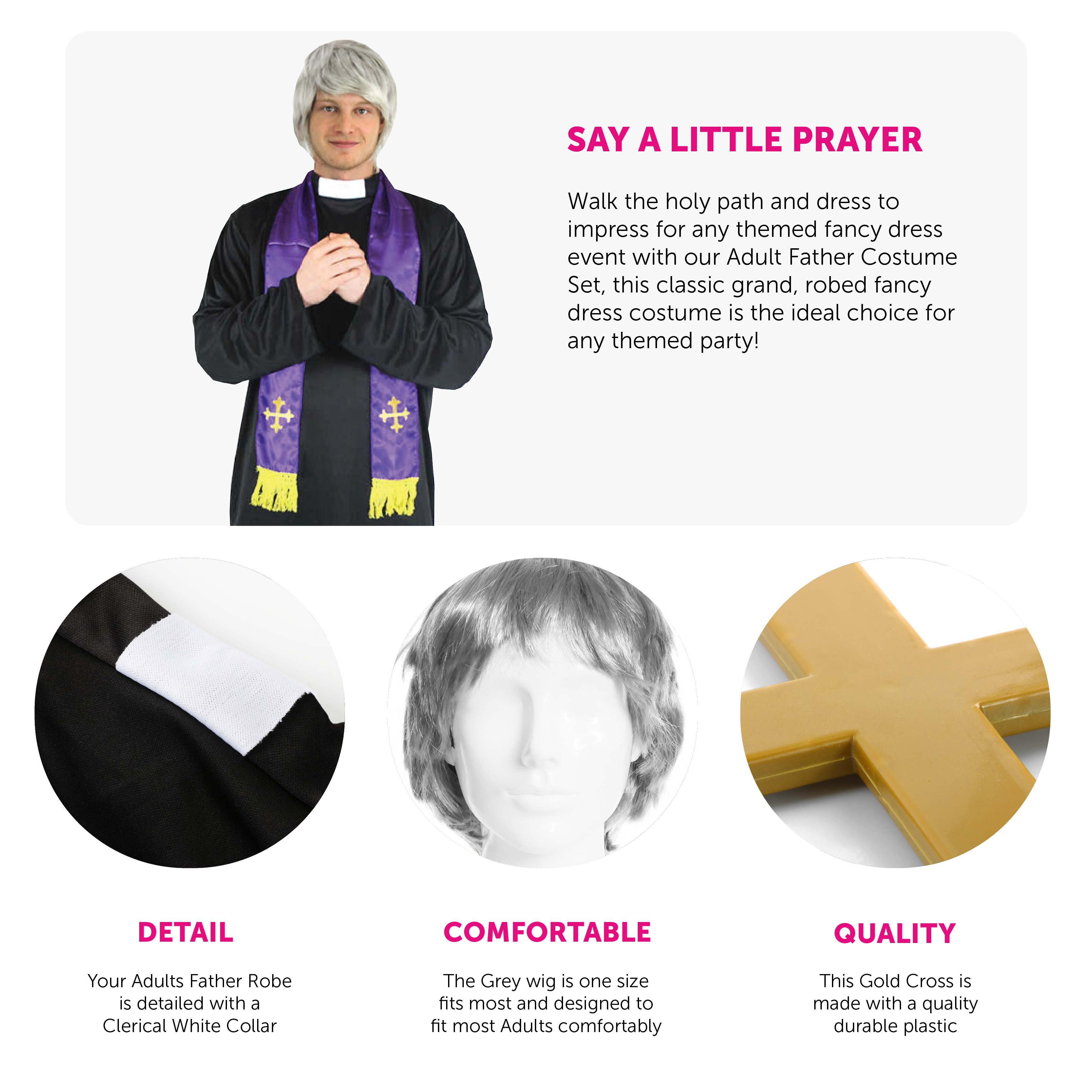 COSTUME SET INCLUDES: This Adults Father Costume includes a Short Grey Wig, a Long Black Robe with a White Collar and Purple Scarf Vestment with Embroidered Gold Crosses and a Large Gold Plastic Cross Necklace, the perfect outfit for any themed fancy dress event!