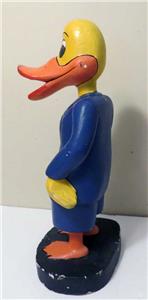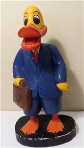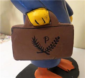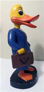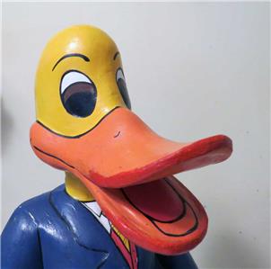 VINTAGE DISNEY PROMOTIONAL 16" TALL DONALD DUCK WOODEN FIGURE. I was told that this one-of-the-kind figure was made for Disney promotional campaign which was never realized, the figure was scraped but saved by an employee at the time. Hand-made and hand-painted. I do not know what was it about but the carry case has some logo with the letter "P". Sold as found in the estate sale.