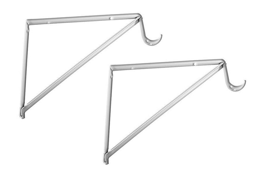 These nonadjustable shelf and rod brackets offer a simple solution to installing a closet pole and shelf by using one type of hardware. They fit 10- to 14-inch wood shelves. The hook hangs down 2-1/2 inches and fits a rod up to a 1-3/8-inch diameter. It can hold up to 400 pounds per pair when mounted into studs.