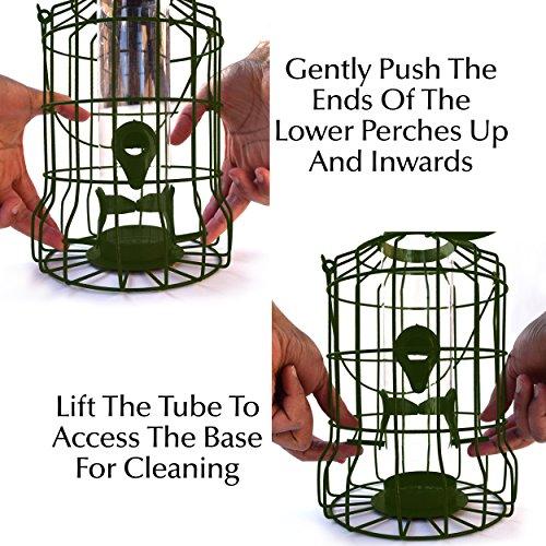 - EFFECTIVE DESIGN: Precisely sized openings to allow in smaller songbirds but not squirrels and larger, undesirable birds. Four well-spaced feeding ports allows for multiple birds to feed simultaneously. Enclosed seed housing keeps up to 2.5 cups of seeds fresh and dry preventing moldy buildup which is harmful for birds. Clear housing lets you see when it's time to replenish seeds. Simply unlatch and raise the lid to refill.