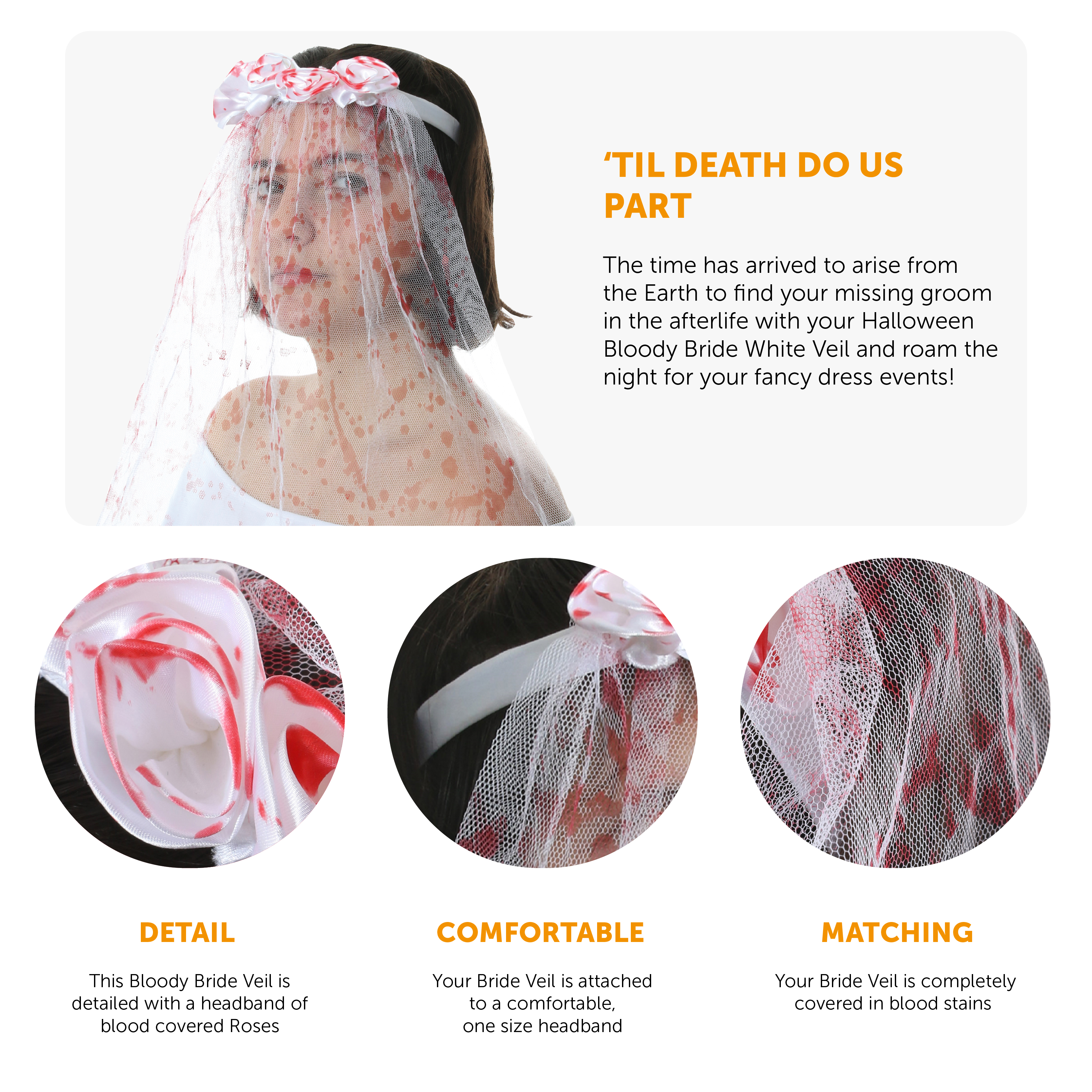 BLOODY BRIDE WHITE VEIL: The time has arrived to arise from the Earth to find your missing groom in the afterlife with your Halloween Bloody Bride White Veil and roam the night for your fancy dress events!