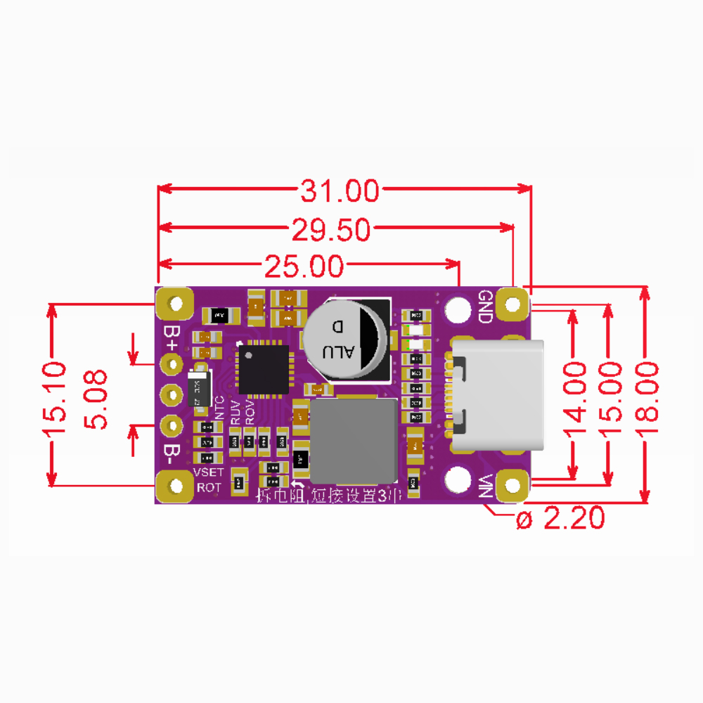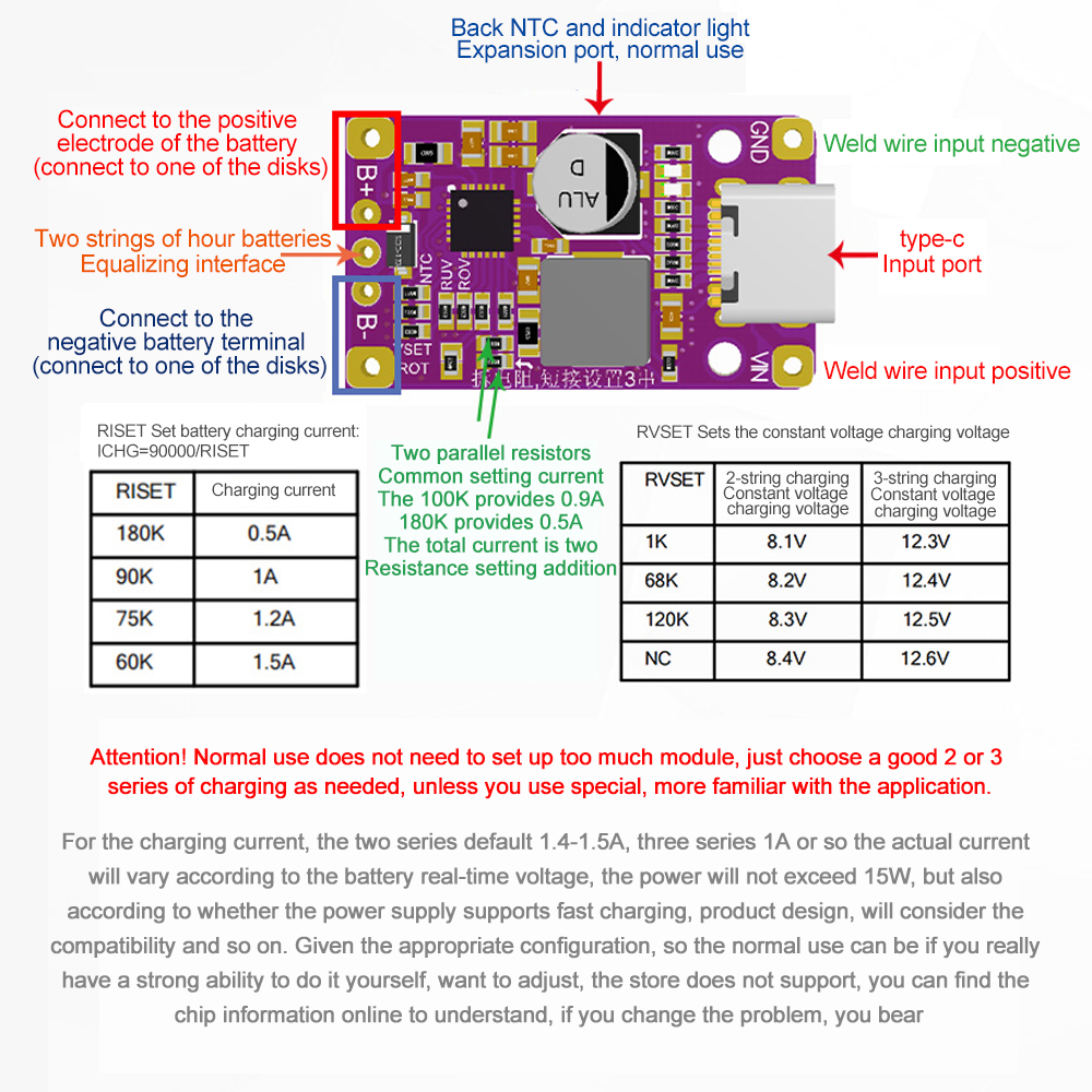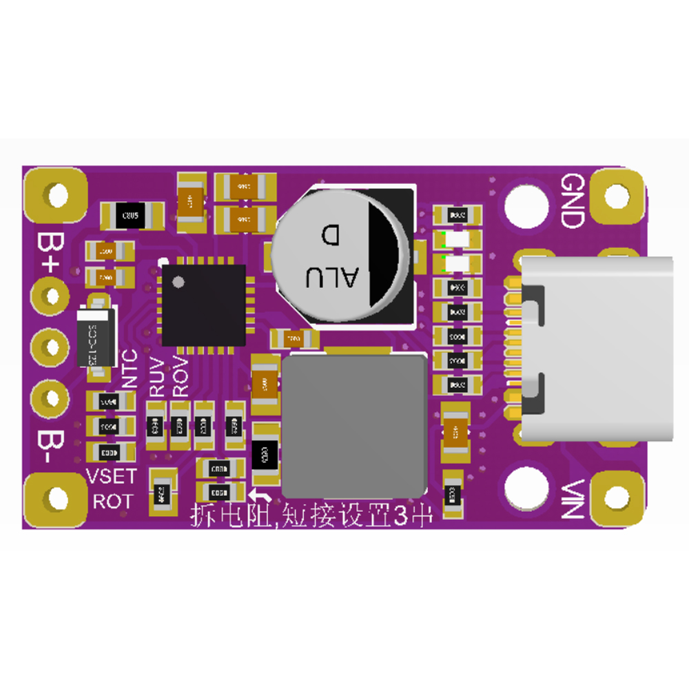 Battery charging voltage setting, the default single string is 4.2V, the general battery is also this value, no need to change. If you need to change it, just set the board VSET resistor according to the RVSET setting table.