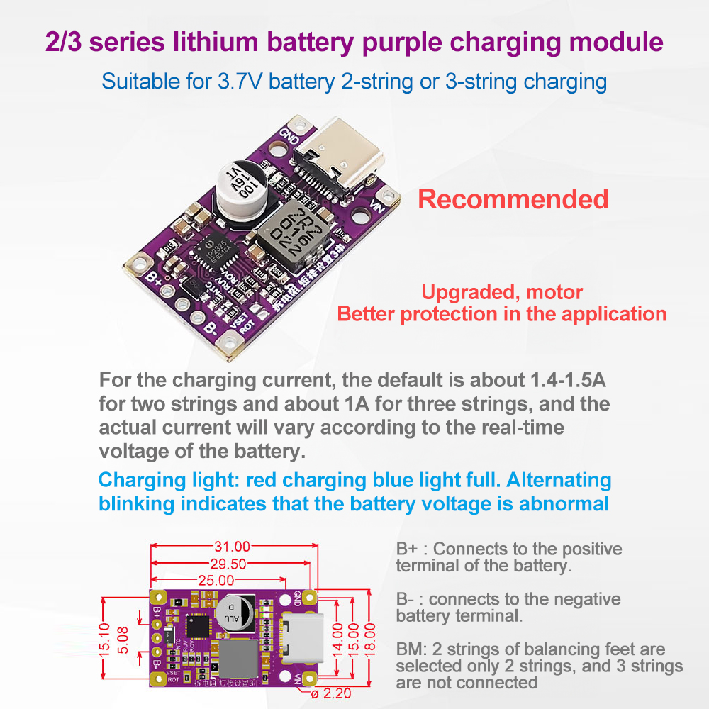 LED indicator: red light is on during charging, blue light is on when charging is full, and blue light is flashing crossly after detecting abnormality. This time to measure the battery voltage is within the appropriate range
