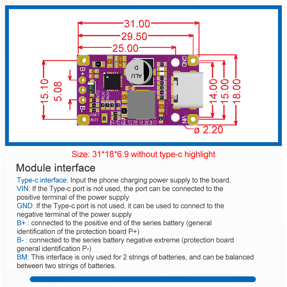Input: optional Type-c port or welding line input, Type-c access QC fast charging can automatically adjust the charging voltage, improve charging efficiency, if welding line input, the input power should be less than the battery voltage (battery series number * battery voltage)