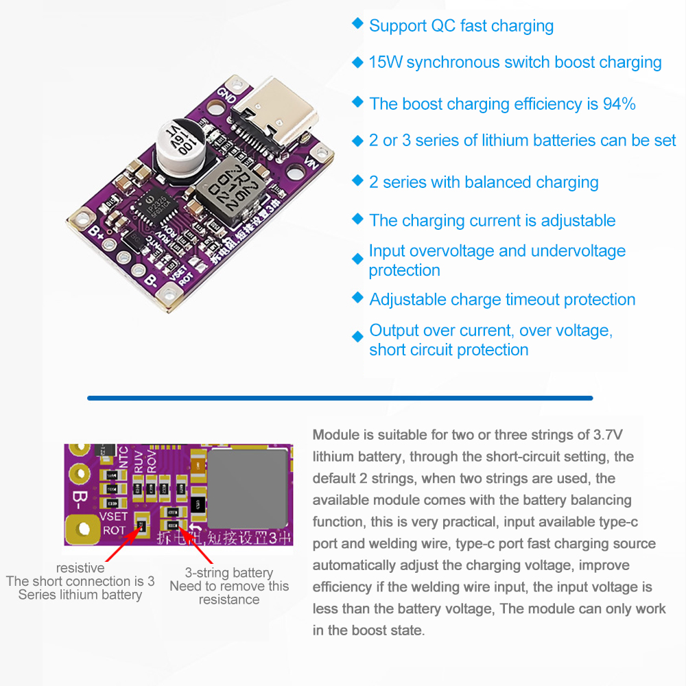 Output: support for 2 series and 3 series, the battery needs to add a protection plate, the default 2 series, change 3 series, need to short the short point, and then remove the side of the resistor. 2 series can be used to equalize the function of the two strings of batteries in the middle of the BM foot (the equalization speed is limited, use the two strings of batteries or try to ensure that the parameters are the same)
