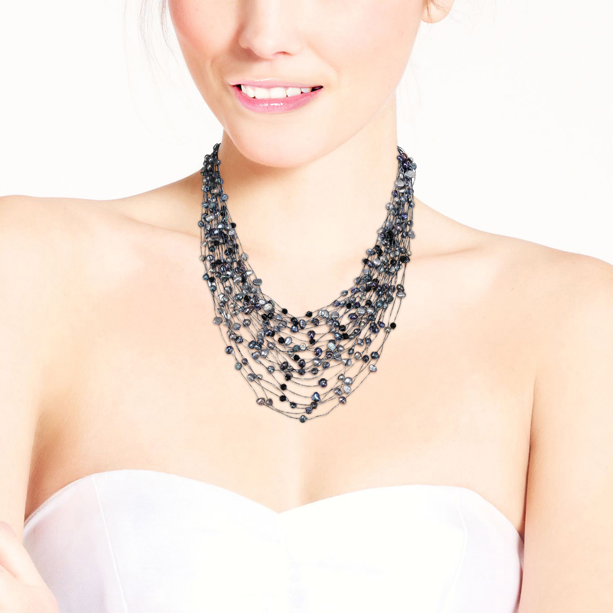 Black Grey Pearl Crystal Silk Layered Multi Strand Necklace |