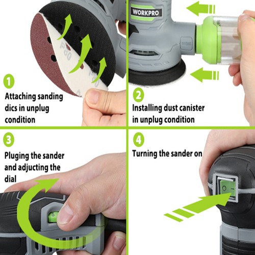 6 Variable SpeedsThe orbital sander has 6 variable speeds and can work from 7000 to 14000 OPM. Allows you to operate the sander at different speeds. | 6.5ft Electric Cords6.5 feet electric cords allow you to use the orbital sander at a considerable distance from a power source. | Sander On/OffSwitch to“-” to turn the sander on Switch to“o” to turn the sander off | Dust Canister InstallationTo install dust canister, align dust port with hole in dust canister, push the canister into the dust port until it locks into place. |